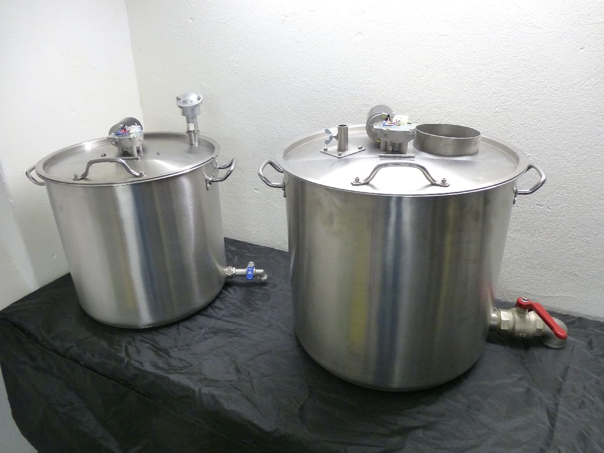 Anbei wie versprochen noch einige Bilder meines neuen Nachgussbereiters bzw. für kleinere Sude kombinierten Maische/Läutertopf. Es handelt sich um einen 50l Topf mit 40cm Durchmesser. Den Deckel habe ich mit der Flex geschnitten und an der Schnittkante des verbleibenden größeren Deckelteils eine Rippe angeschweißt. Für den Temperaturfühler habe ich diesmal direkt eine 1/2" Muffe auf den Deckel geschweißt. Die Läuterhexe (1800er) habe ich gekürzt so dass sie sauber am Rand des Topfes anliegt. Mir war der Ablauf etwas zu hoch und zudem stand mir das T-Stück zu weit im Topf, deshalb habe ich einen 1/2" VA-Bogen mit dem T-Stück auf Maß verschweißt. Damit der Temperaturfühler möglichst tief bis auf den Boden reicht habe ich den neben der Hexe platziert. Als Verdrehsicherung des Deckels dienen wie bei meinem großen Topf einfach 2 VA-Stifte am Deckel, die in 2 Löcher im Topf greifen.