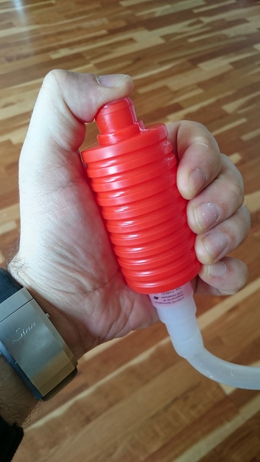 Mit der anderen Hand knicke bzw. klemme ich den Schlauch ab, der ins "Zielgefäß" kommt. Dann pumpen bis ausreichend Flüssigkeit (Bier/Würze/wasauchimmer) im Schlauch ist, den Knick lösen und die Würze läuft...