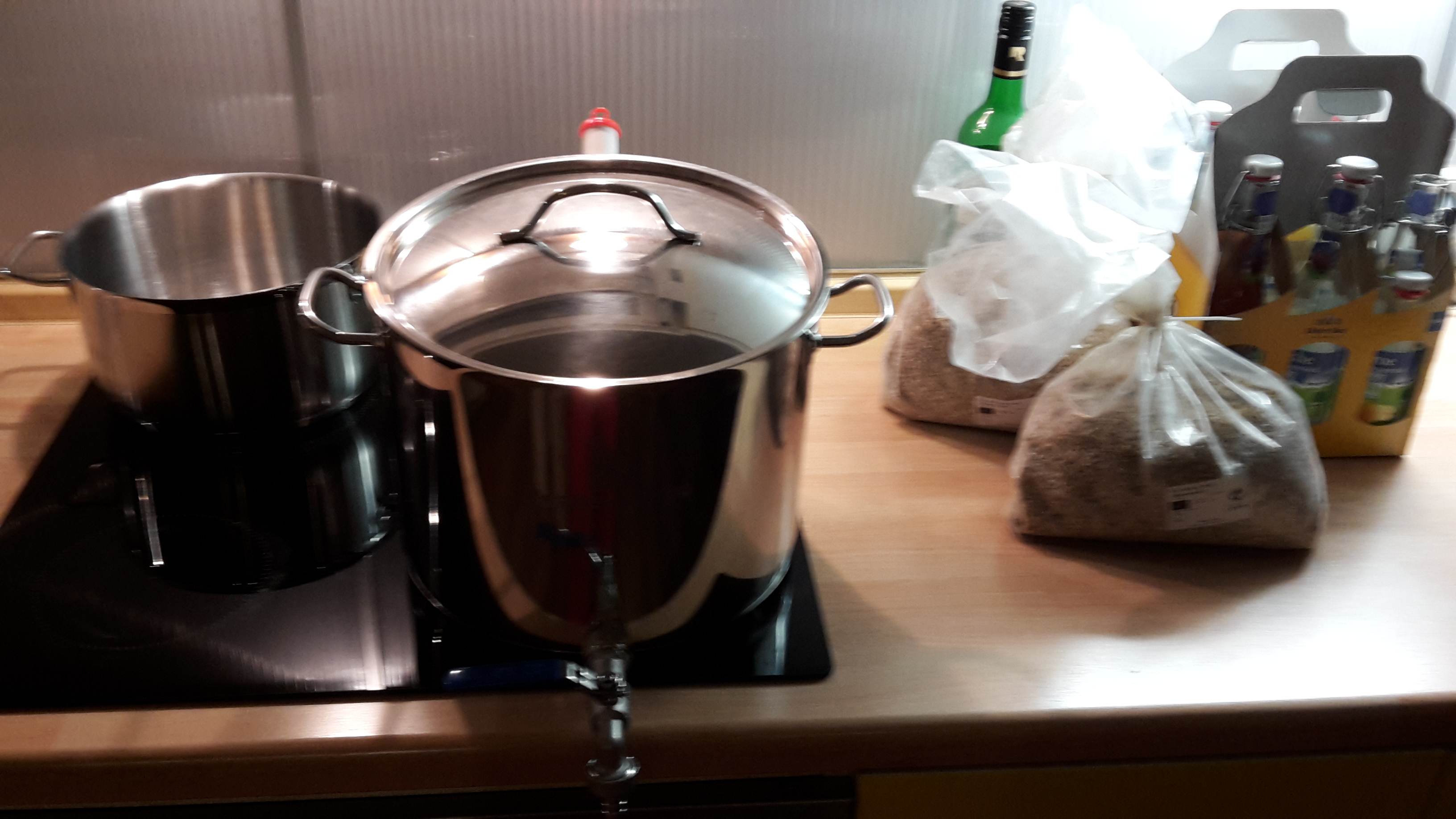 Wallendes Kochen, dank 1,5KW Tauchsieder innerhalb weniger Minuten. hinten die ca. 4l mit 2°P zum Verdunstung ausgleichen