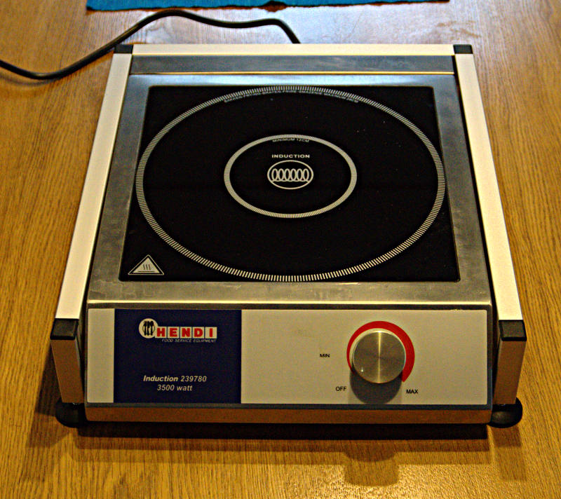 Der Topf ruht auf den Kanten dreier Backsteine (ähnlich einer germanischen Feuerstelle) und die Billigplatte steht dazwischen. Mit Schaumgummiklötzen unter den Füssen der Platte wird diese dann gegen den Topfboden gedrückt.