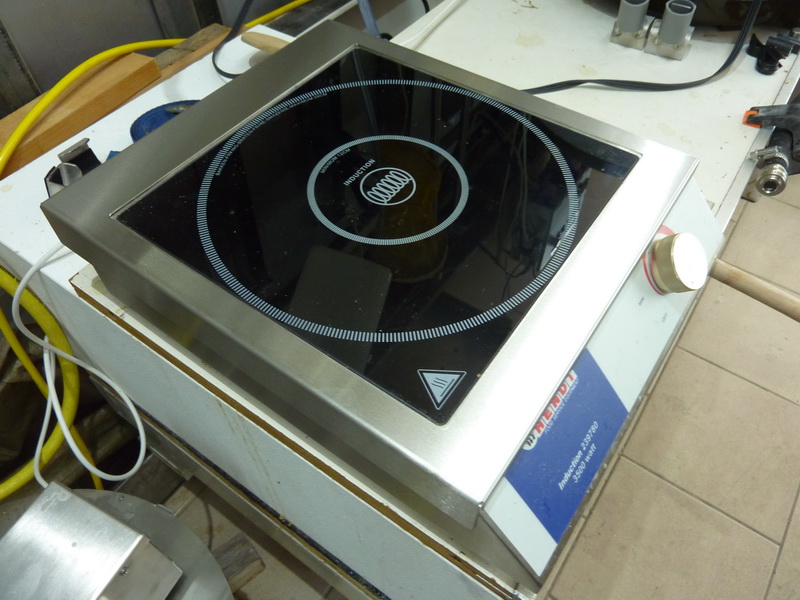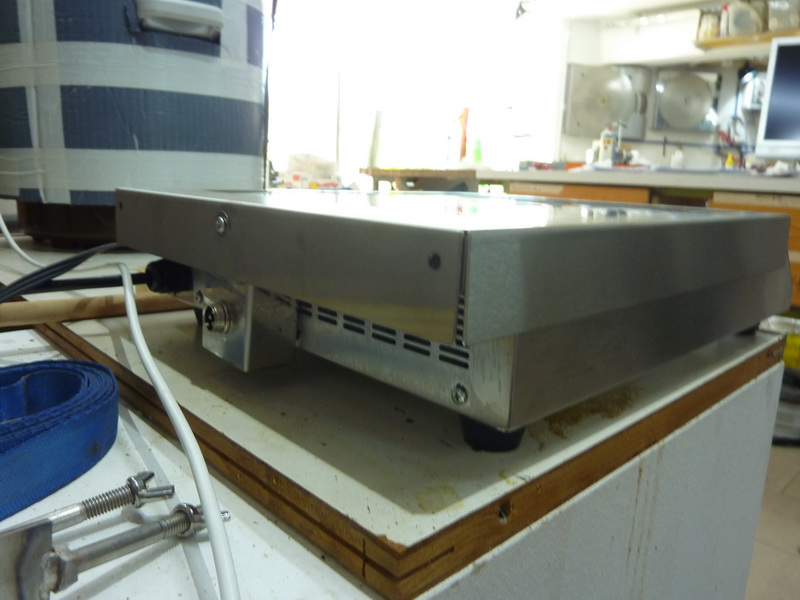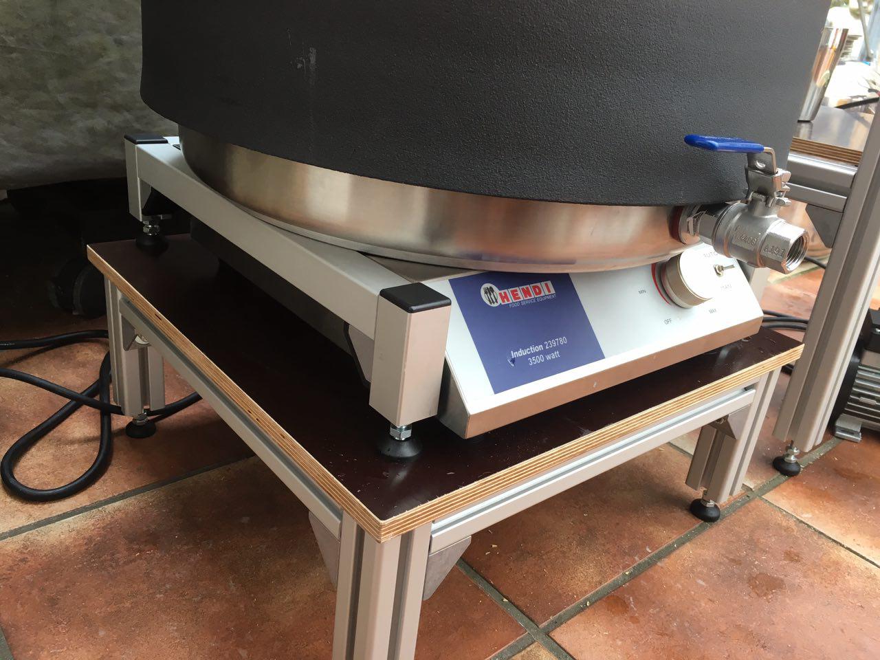 Ich habe von Anfang an hinten an der Platte die kleine Edelstahlleiste abgeschraubt (ist plan mit der Oberfläche) und habe ein Alu-U-Profil von 6 cm breite aus dem Baumarkt passend gesägt, also die Aussparungen für die Lüfter hinten in das Alu-U Profil übertragen. Anschließend habe ich die Alu-Vorrichtung plan hinten anstelle der Leiste angeschraubt. Das Alu-Profil habe ich noch mit zwei kleinen, durch schrauben verstellbaren Alu-Möbelfüssen aus dem Baumarkt versehen. Wenn ich braue , schraube ich die Füße soweit heraus, das sie die Last mit aufnehmen, oben aber das Alu-Profil plan bleibt. Den Topf stelle ich dann vor dem Einmaischen auf die Platte und soweit nach hinten mit auf das Aluprofil, das hier ein Teil der ganzen Last getragen wird. Funktioniert prima auch bei 12 Kg Malz und ca. 50l Wasser. Die Wärmeverteilung ist durch mein Rührwerk gegeben, bei Bedarf kann die Hendi-Platte auch durch Austauschen der Originalleiste gegen das Alu-Profil wieder zurück gebaut werden, sind lediglich 3 Schrauben zu lösen.