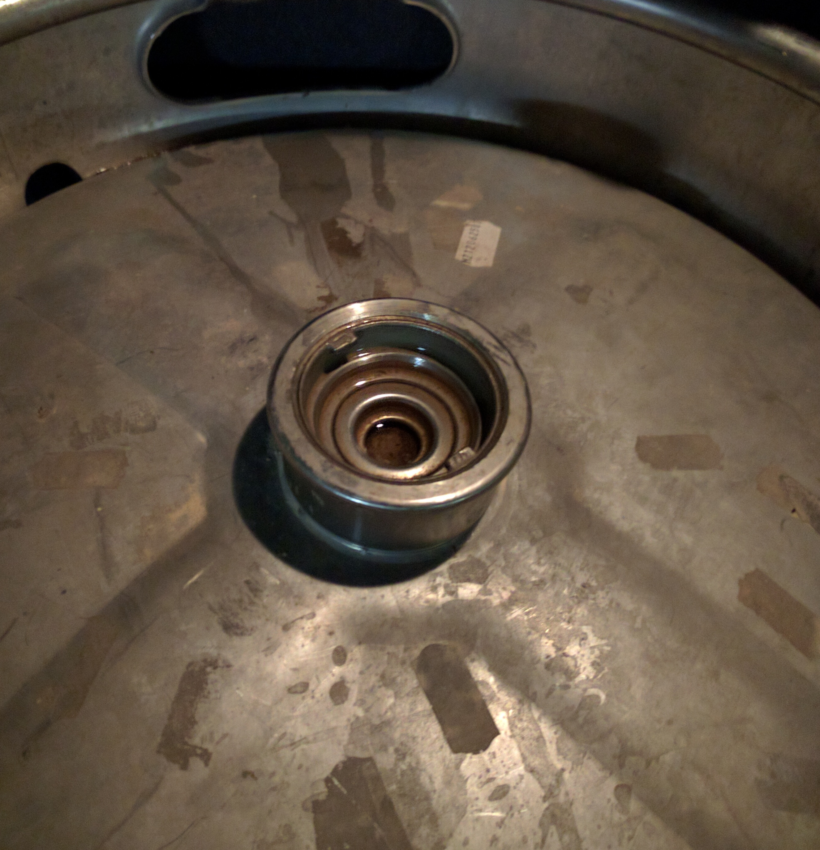 Es gibt anscheinend mehrere Sicherungssysteme. Die KEGs von mir sind wohl etwas älter, hier dreht man den Fitting so lange, bis das Gewinde aufgeschraubt ist und der Fitting nur noch durch die Sicherung im Fass gehalten wird. Dann muss man tief in die Kiste greifen und ein 1 Pfennig Stück suchen. Es geht auch mit Cent, aber lange nicht so gut. Dieses Geldstück legt man dann in die Mitte vom Fitting rein und steckt den Zapfkopf drauf, als ob man das Fass anschließen will. Dadurch, dass das Fitting weiter als normal runter gepresst wird, werden bei diesem System die Widerhaken nach innen gezogen und man kann den Fitting raus ziehen. Das Prinzip ist das gleiche, wie bei Schwartenbeks vorgestellt, allerdings ohne Teile zu basteln.