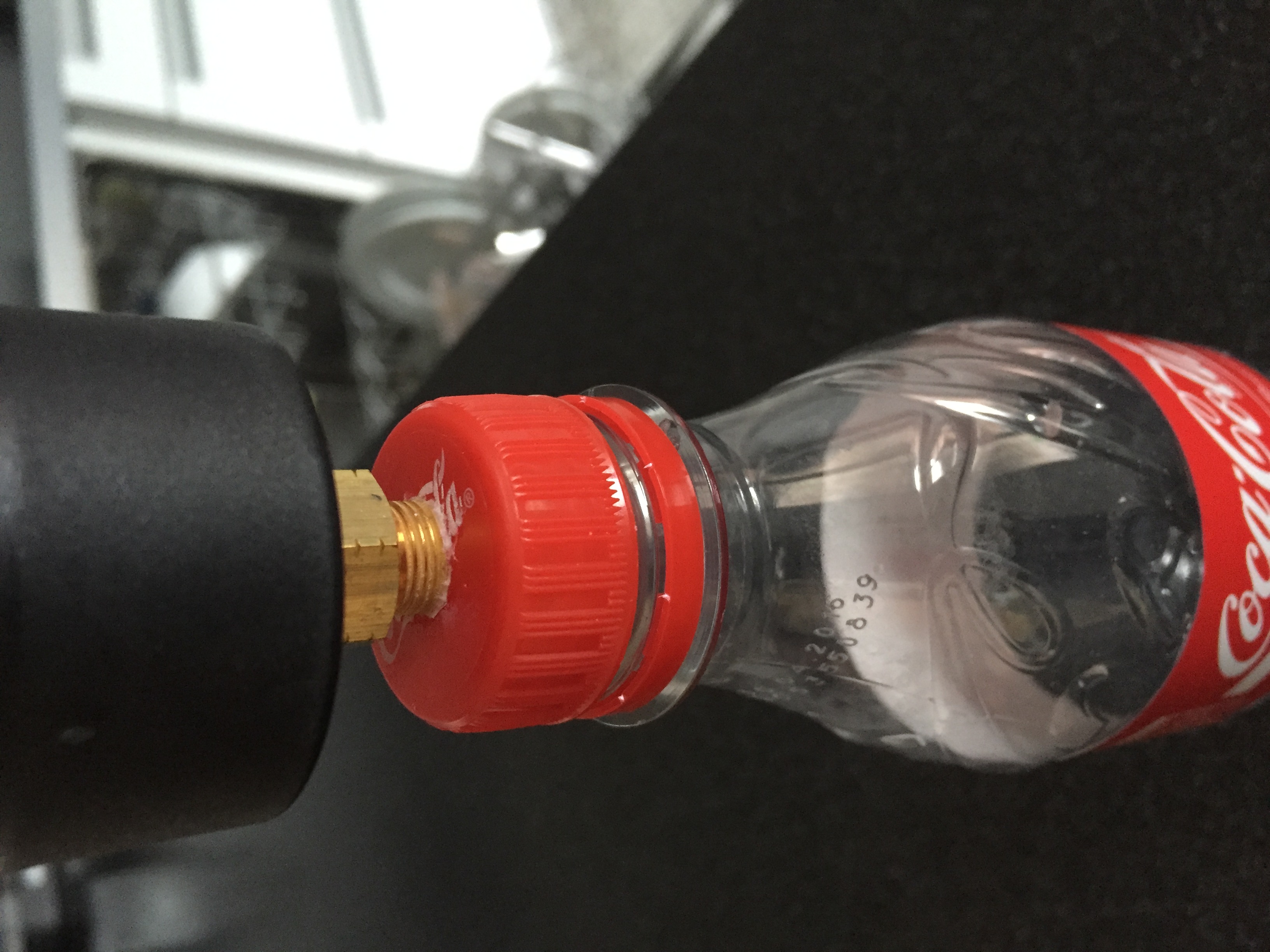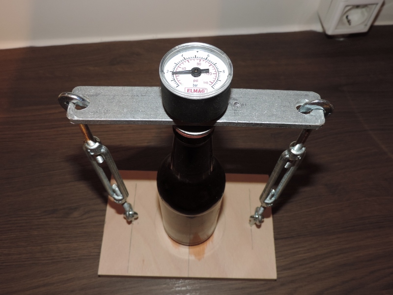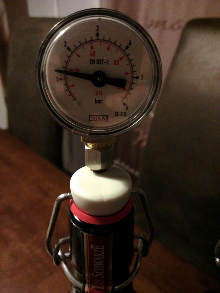Dies ist eine Testflasche von der Stange, weil die Dichtigkeitsprüfung mit Zuckerwasser und Hefe keine verläßlichen Daten liefern kann. Manometer aufsetzen, auf Druck schütteln und abwarten, ob Verluste auftauchen. Lecksuchspray oder Wasserbad können auch zu Hilfe genommen werden.