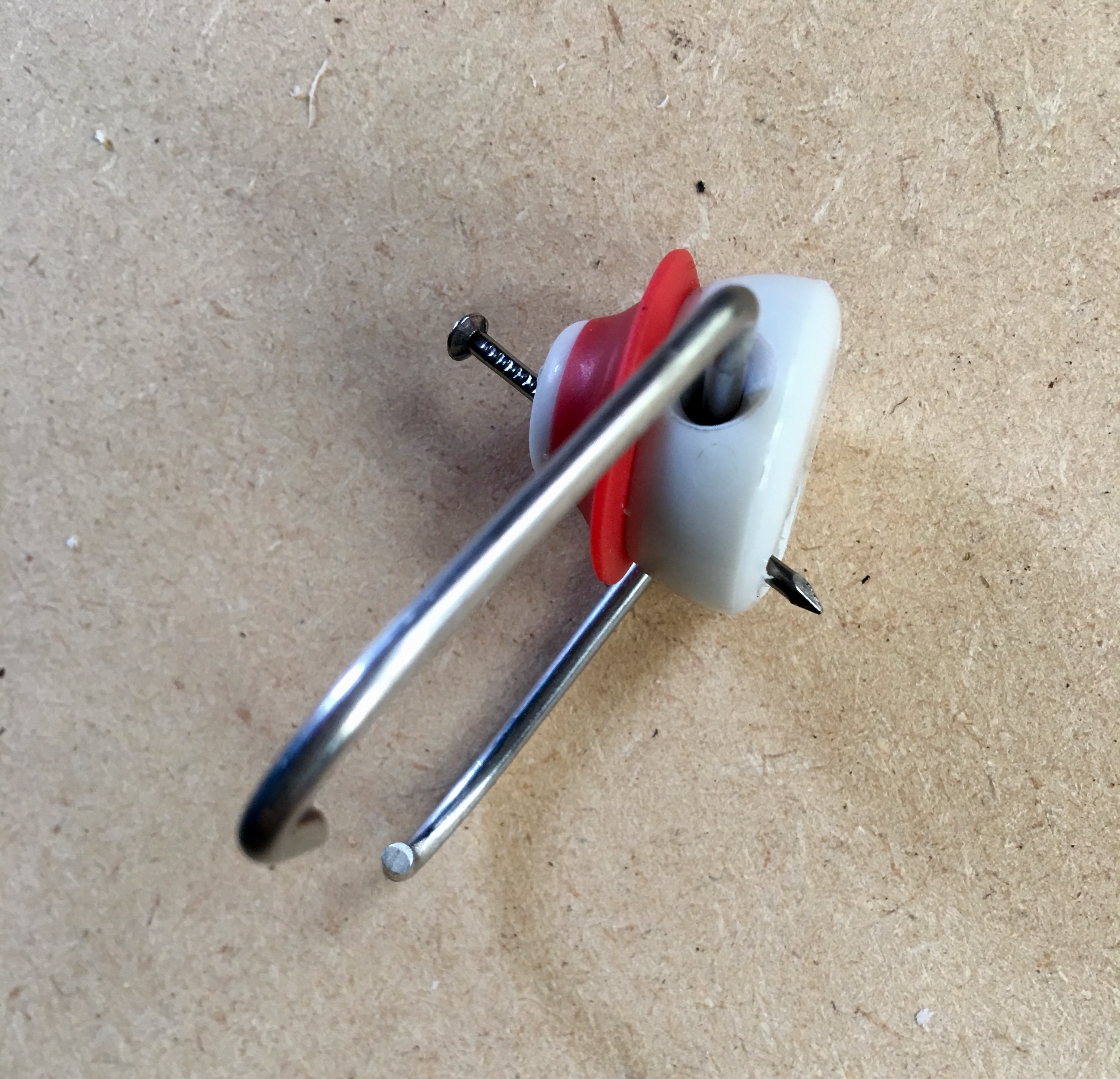 Die Bügel habe ich aus Kleiderbügeln gebogen, das Aluteil oben ist dafür, dass sich die Gewindestangenenden nicht so herunterziehen lassen; die kleinen Aluteile neben dem Bügel haben ebenso ein Gewinde und dienen lediglich dazu, dass der Bügel selbst nicht so schlackert. Die Gewindestangen sind mit Loctite blau eingeklebt und damit dicht.