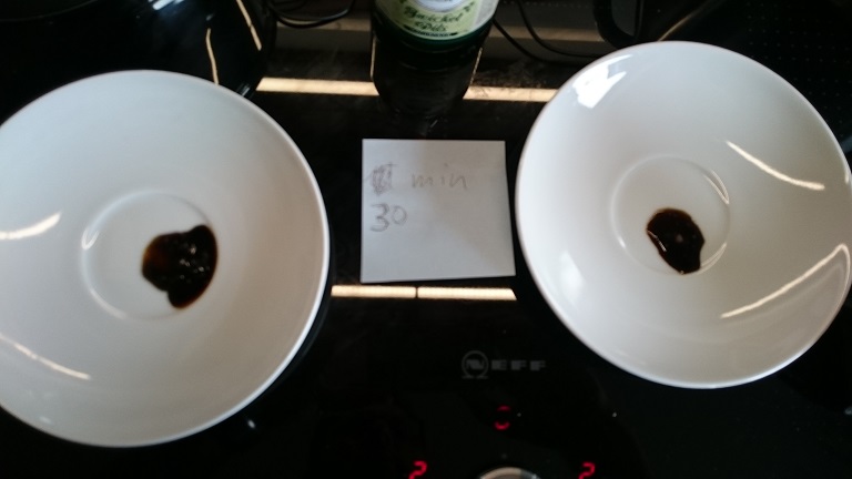 Hierfür habe ich in 2 Töpfen parallel Polentagries und Wiener Malz (jeweils 30 g Gries und 70 g Malz in 400ml Wasser) bei 67°C gemaischt und laufend Jodproben gemacht.