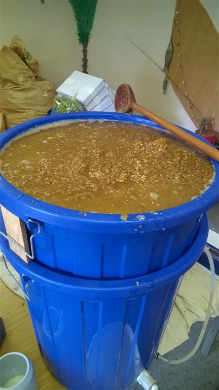 Links die Pfanne mit umgebautem Rührwerk und rechts der Läuterbottich mit der Hexe. Bin echt begeistert von der Hexe :thumbup :thumbup :thumbup