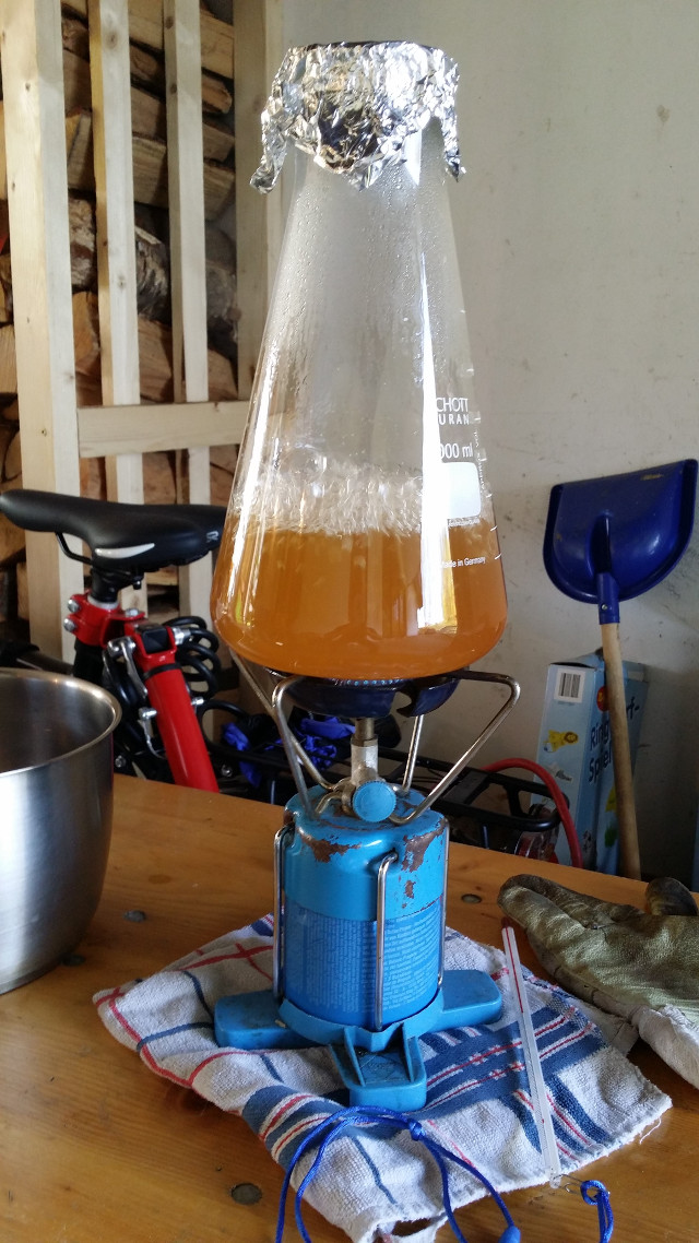 3 Tage vor dem Brautag habe ich auf dem Herd einen Minisud gemacht um Speise für meinen Hefestarter zu haben. „Läutern“ mit Küchensieb ist wirklich kein Spaß, aber geht. Danach musste sich die gute Gutmann-Hefe einige Zeit im Kreis drehen.