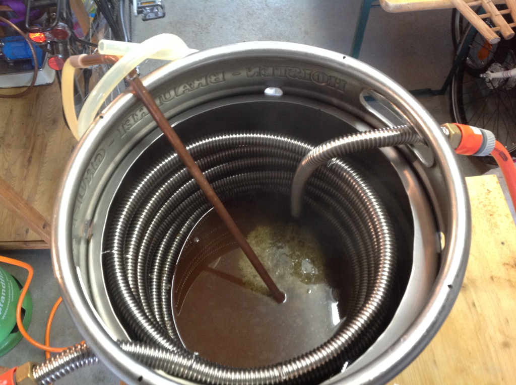 Man kann sehen, dass an diesem Brautag mit Pellets gearbeitet wurde. Da klappt das mit dem Wirlpool eigentlich immer ganz gut. Zumal das Fass unten auch konisch zuläuft. Beim ersten Mal mit Doldenhopfen hingegen war das Ausschlagen eine Katastrophe. Die Dolden haben sich immer wieder im Schwanenhals verklemmt. Ich musste so viel rumfummeln, dass ich mir am Ende doch noch eine Infektion gefangen hatte. Diesmal habe ich einen Topfreininger in den Schwanenhals gesteckt. Das hat super funktioniert, auch wenn noch nicht der Weisheit letzter Schluss. Die Kühlleistung der Kühlspirale ist in jedem Fall wirklich enorm gut.