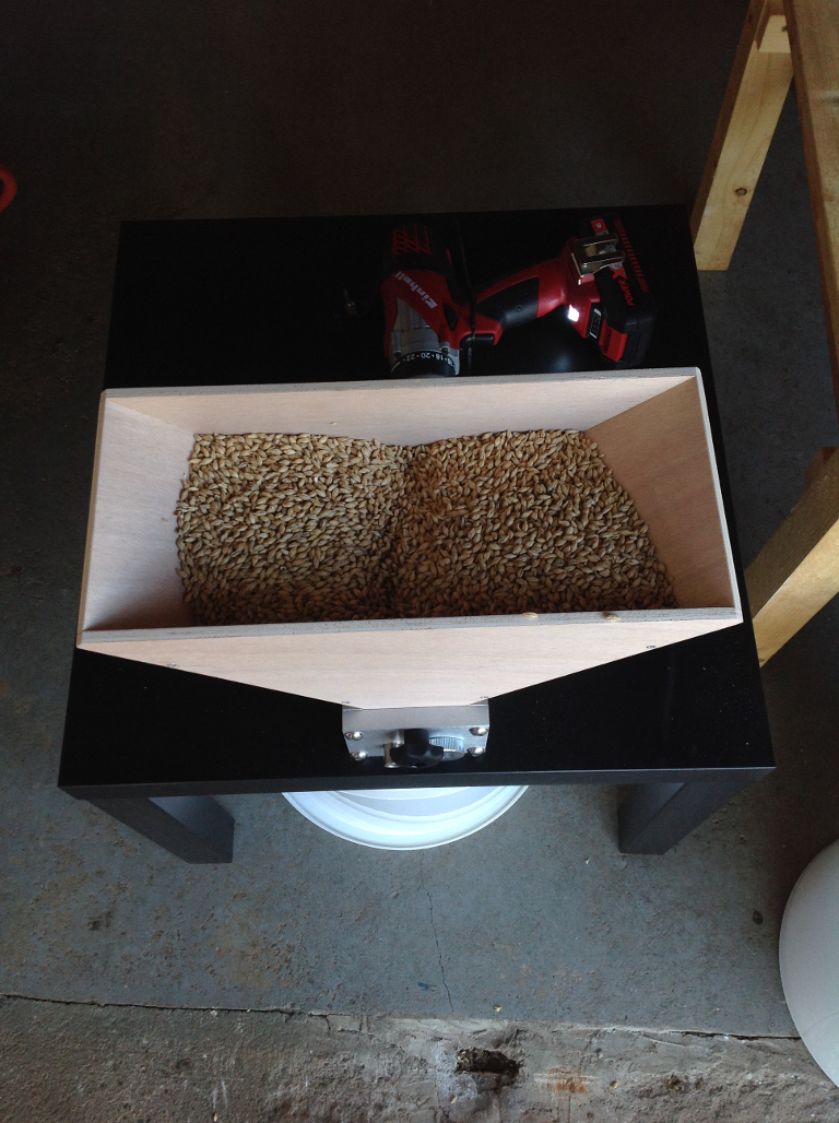 Dann kommt auch schon Neuerung 1 ins Spiel: Meine Mattmill-Klassik! Meine Freunde haben mir die zum letzten Geburtstag geschenkt. Superklasse!!! Auf diesem Weg noch mal herzlichen Dank dafür! Mein Bruder hat mir dann noch den Trichter gebastelt und ein IKEA-Tischchen für 3,99€ aus der Ramschecke kam auch noch zum Einsatz. Mit Fühlerlehre dann noch den (übrigens nicht werkseitig eingestellten) Spalt von 1,3mm eingestellt und den neuen Akkuschrauber dran montiert. Schafft der wirklich locker die Last. Fazit: Das Auf- und Abbauen dauert deutlich länger als das Schroten. 5,5kg in 1:38Min. Da könnte ich schon einer größeren Brauerei aushelfen :Bigsmile