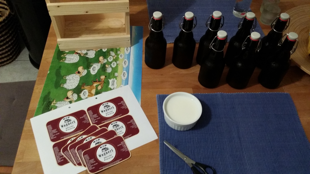 Die Etiketten drücke ich einfach auf weißes Kopierpapier mit einem Farblaser. Dann schneide ich die aus und klebe mit einer Milch-Wasser (1:1) Mischung auf die Flasche. Mit ein bisschen Übung geht das sehr gut. Außerdem kann man dann die Etiketten beim Ausspülen der Flasche auch gleich mit abmachen. Einfach die Flasche außen auch kurz abwaschen. Dabei löst sich das Etikett sofort. Im trockenen Zustand klebt es super.