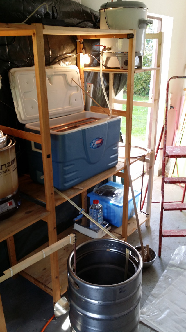 Im nächsten Bild dann Neuerung 8: Ein Brautisch, selbst gebastelt. Hier steht der Kessel zum Wirlpool auf zwei Fliesen auf dem Brautisch.