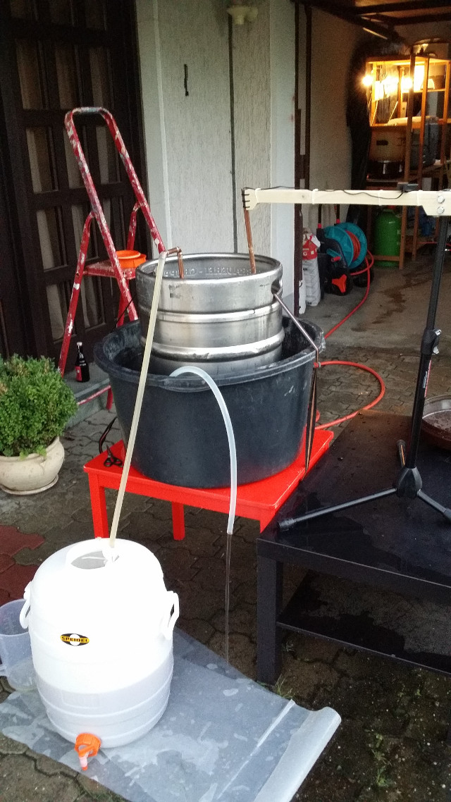 Zum Schluss dann in die Badewanne um endlich irgendwann Anstelltemperatur zu erreichen. Mann ich brauche einen Gegenstromkühler. Ist aber derzeit nicht im Budget. Nach dem Anstellen und Belüften das Fass noch in den Keller für 18°C Umgebungstemperatur und dann endlich ins Bett.