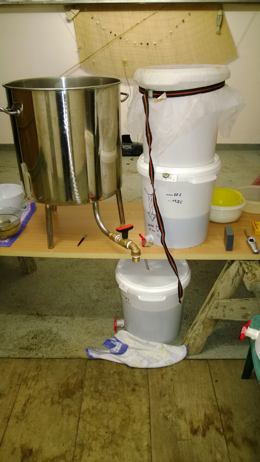 Derzeit schöpfe ich nach Kochende die Würze einfach mit einem 5l Meßbecher aus der Sudpfanne in den Gärbehälter durch einen Nylonfilter.