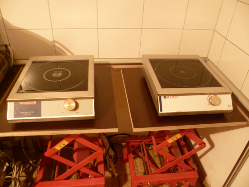 Der Topf ruht auf den Kanten dreier Backsteine (ähnlich einer germanischen Feuerstelle) und die Billigplatte steht dazwischen. Mit Schaumgummiklötzen unter den Füssen der Platte wird diese dann gegen den Topfboden gedrückt.