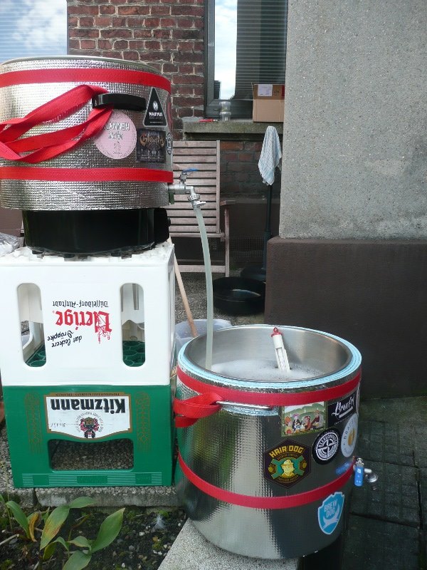 Der Einkocher dient zur Infusion, der Beerfest steht beim Maischen auf einer Kiste unterhalb des Einkochers.