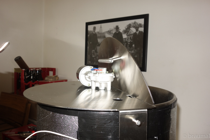 Hier die Anlage mit 2 Einkochern und einem 70 Liter TP zum Gären (dann passt der beim Ausbau der Anlage immer noch, ist allerdings schon etwas gross). Einmaischen Abläutern. Hier das erste Problem, der Saugdruck im Schlauch war zu gross, vielleicht bau ich mir einen Zwischenspeicher für den nächsten Sud.