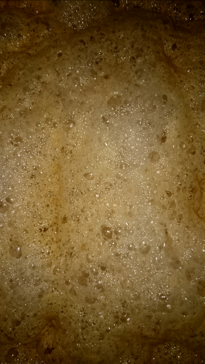 Ein belgisches Wit mit der Wyeast 3944. Kräusen ohne Ende. 50 % Kopfraum braucht man bei der locker. Eher 75%. Gleichzeitig ist die ne ziemliche Schnarchnase und gärt gemächlich vor sich hin. Wahrscheinlich weil so viel Hefe oben drauf schwimmt.