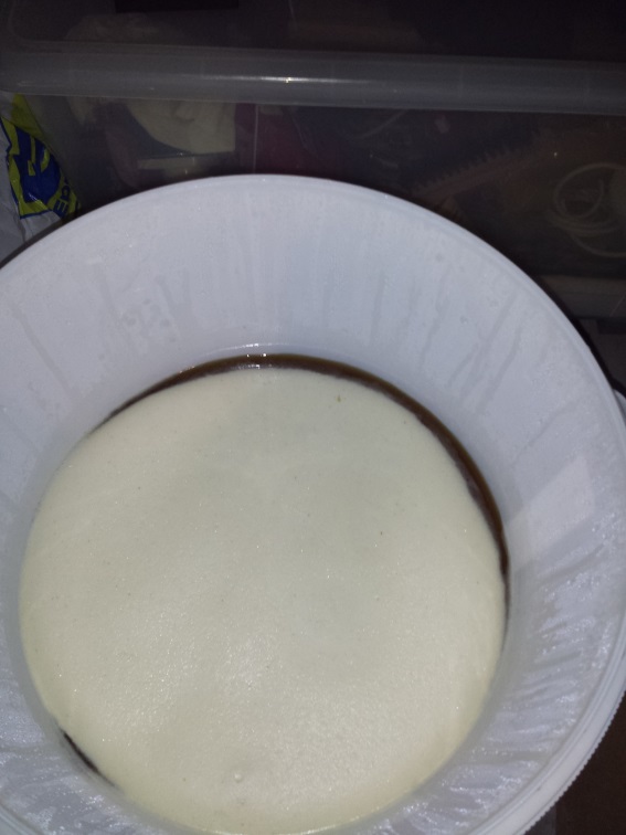 Ich habe dann die 17 Liter Ausschlagwürze über Nacht abkühlen lassen. 17 Liter kamen mir recht wenig vor. Die Punktlandung bei 17°P hat mich aber beruhigt. Die Hefe habe ich bei 22°C rehydriert, langsam auf Würzetemperatur 16°C runtergekühlt und Sonntag Mittag endlich anstellen können. Seit Montag Mittag blubbert es fein und wie auf dem Bild zu sehen ist, gibts eine sehr feine Schaumbildung. Die Öffnung für das Foto war bisher die einzige. Bis MIttwoch oder Donnerstag behalte ich das Geschehen über das Blubbern des Gährrörchens im Blick.