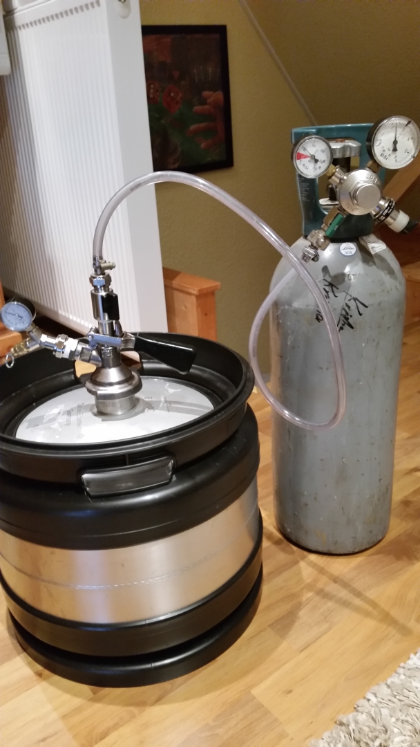 Ganz vergessen: UNBEDINGT die Gasflasche aufrecht stellen und an die Wand binden. Liegen darf sie nicht, damit kein flüssiges CO2 in den Minderer kommt. Und wenn sie während der Aktion umfällt, kann auch Einiges passieren.