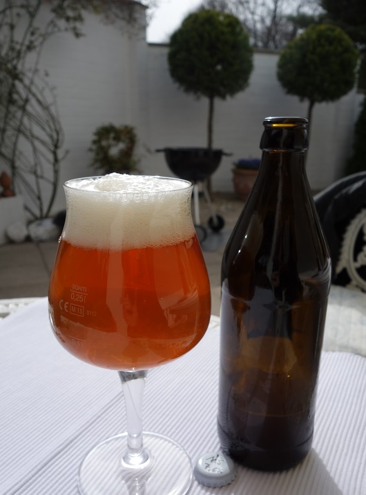Aussehen: Goldig (heller als im Bild), sehr trüb, feinporiger, nicht sehr lang stehender Schaum