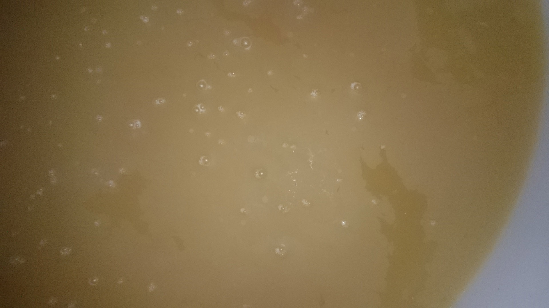 Ich hab vor 2,5 Wochen 15l naturtrüben (pasteurisierten) Apfelsaft mit der Godzawa French Cider angesetzt. Bin jetzt irgendwo bei <1°P, Start war bei 12,5°P. Es gab keine wirkliche Kräusenphase, zumindest ist am Rand nix dergleichen zu erkennen. Ich habe heute mal den Deckel aufgemacht und folgendes Bild vorgefunden: Da ich grad ne nicht endende Infektionswelle in meinen Bieren hab, vermute ich natürlich hier auch eine Infektion (siehe viewtopic.php?f=7&t=7204). Es liegt eine matte Schicht auf dem Cider mit ein paar Blasen. Die Schicht ist noch nicht komplett über die gesamte Fläche, es gibt noch ein paar Flächen, die so schollenmäßig frei sind.