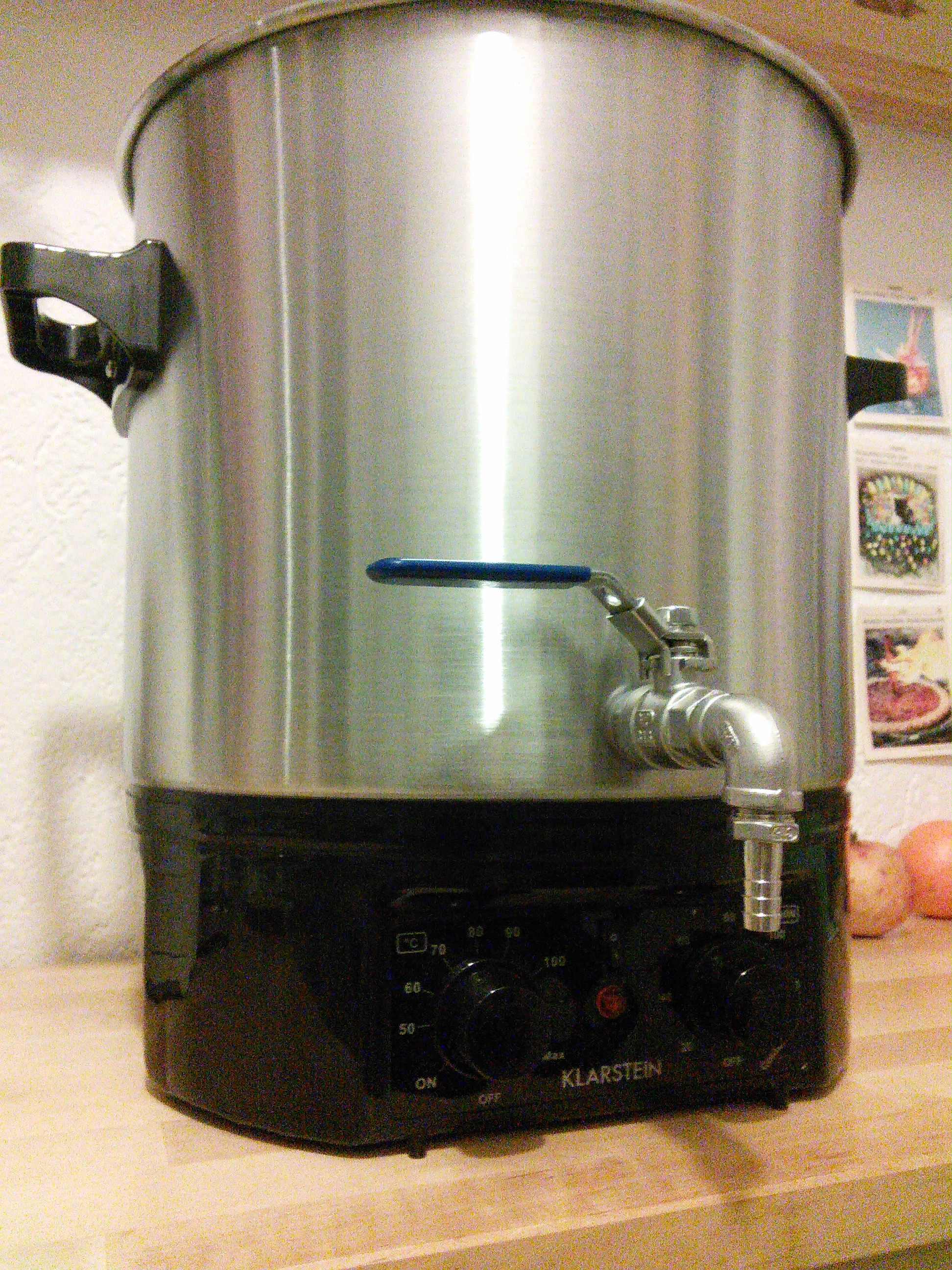 Hier ein paar Bilder: Ich habe den Einkocher mit Wasser befüllt und auf max gestellt. Die üblichen Heizraten von 1 Grad / Minute gelten hier auch. Was aber schon auffällt ist, dass die Heizspirale anscheinend nur unter dem ersten Kreis des Bodens sitzt. Normalerweise sitzt diese ja im mittleren Ring. Evtl ist das der Unterschied zu den 1800W Kochern. Wallendes Kochen war ebenfalls kein Problem. Demnach kann ich meinen Tauchsieder nun nur noch als "Beschleuniger" einsetzen. Schön ist ebenfalls, dass ich diesen Kocher ohne Umbauten automatisieren kann, da dieser "an und aus" versteht. Die Zeitschaltuhr ist ein wenig anders als beim ProfiCook. Hier muss man warten, bis die gewünschte Temperatur eingestellt ist und erst dann kann der Timer manuell gestellt werden. Die Temperatur wird dann aber +/- 2 Grad gehalten. Der Plastikhahn wird noch gegen einen Edelstahlhahn getauscht.