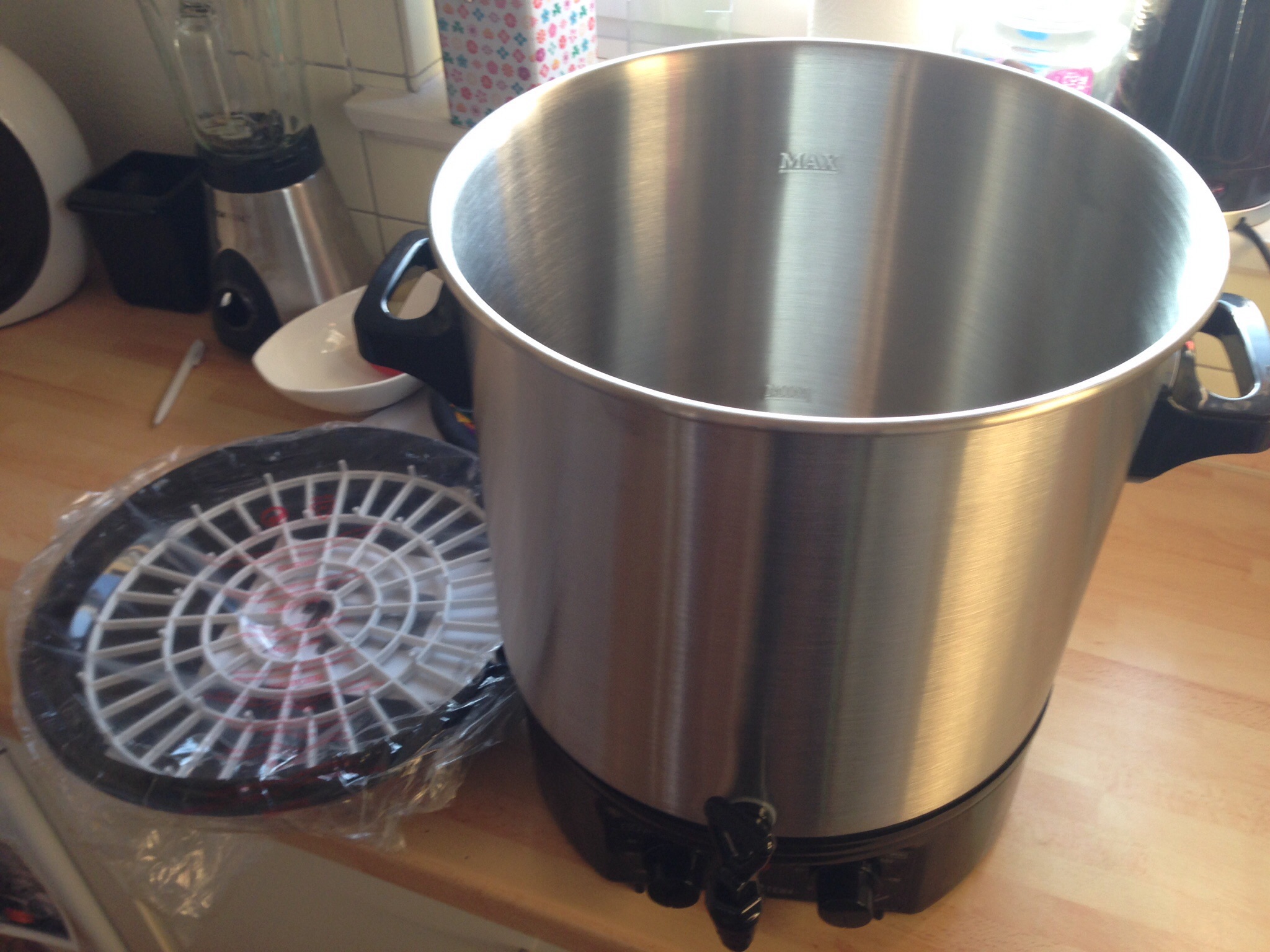 Hier ein paar Bilder: Ich habe den Einkocher mit Wasser befüllt und auf max gestellt. Die üblichen Heizraten von 1 Grad / Minute gelten hier auch. Was aber schon auffällt ist, dass die Heizspirale anscheinend nur unter dem ersten Kreis des Bodens sitzt. Normalerweise sitzt diese ja im mittleren Ring. Evtl ist das der Unterschied zu den 1800W Kochern. Wallendes Kochen war ebenfalls kein Problem. Demnach kann ich meinen Tauchsieder nun nur noch als "Beschleuniger" einsetzen. Schön ist ebenfalls, dass ich diesen Kocher ohne Umbauten automatisieren kann, da dieser "an und aus" versteht. Die Zeitschaltuhr ist ein wenig anders als beim ProfiCook. Hier muss man warten, bis die gewünschte Temperatur eingestellt ist und erst dann kann der Timer manuell gestellt werden. Die Temperatur wird dann aber +/- 2 Grad gehalten. Der Plastikhahn wird noch gegen einen Edelstahlhahn getauscht.