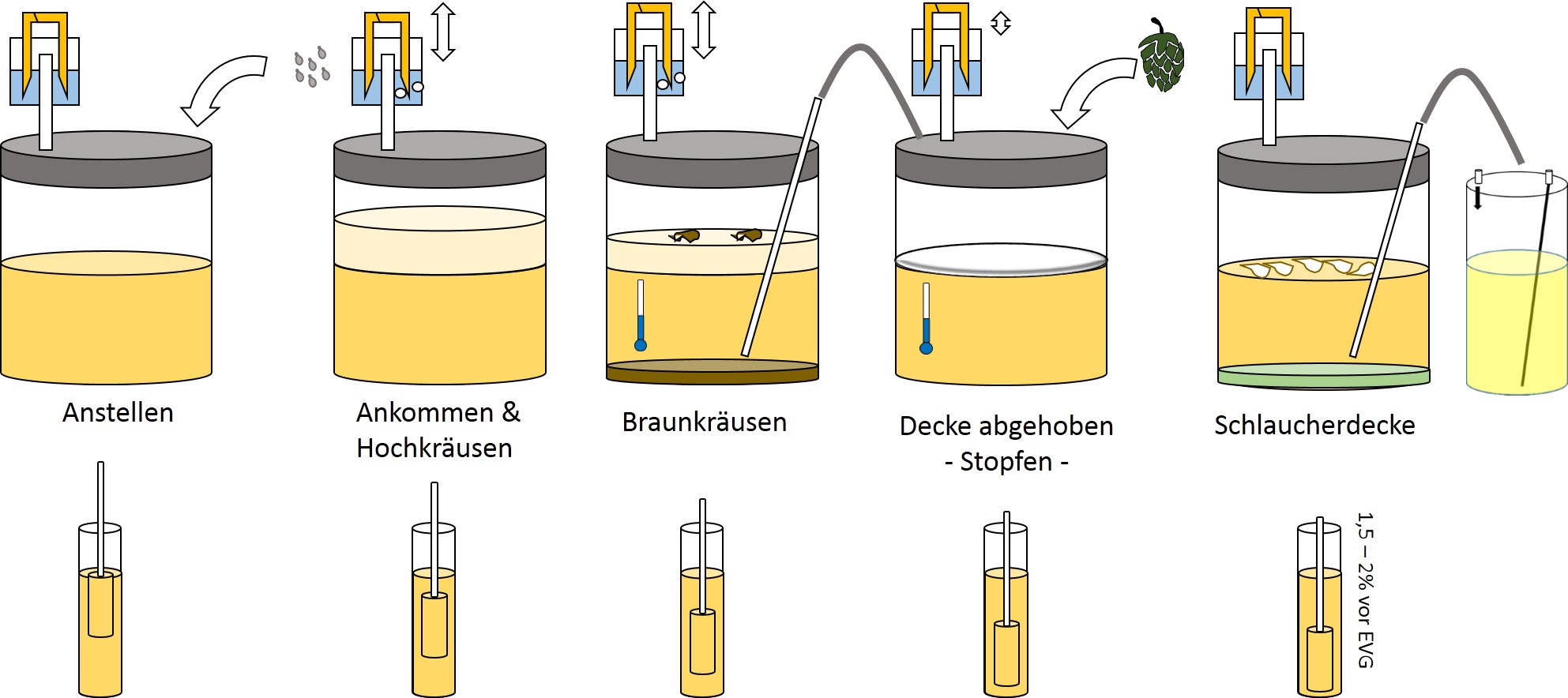 Hat man im Fass 1 eine gekuerzte Steigleitung, kann man die Erntehefe daraus entnehmen. Arbeitet man nach Variante 2, kann man die Erntehefe vorher schon aus dem Fass entfernen, man muss halt dann das vorschiessen in einen Auffangbehaelter vornehmen. Ich verwende die Hefe aus der HG und hab damit weniger das Problem.