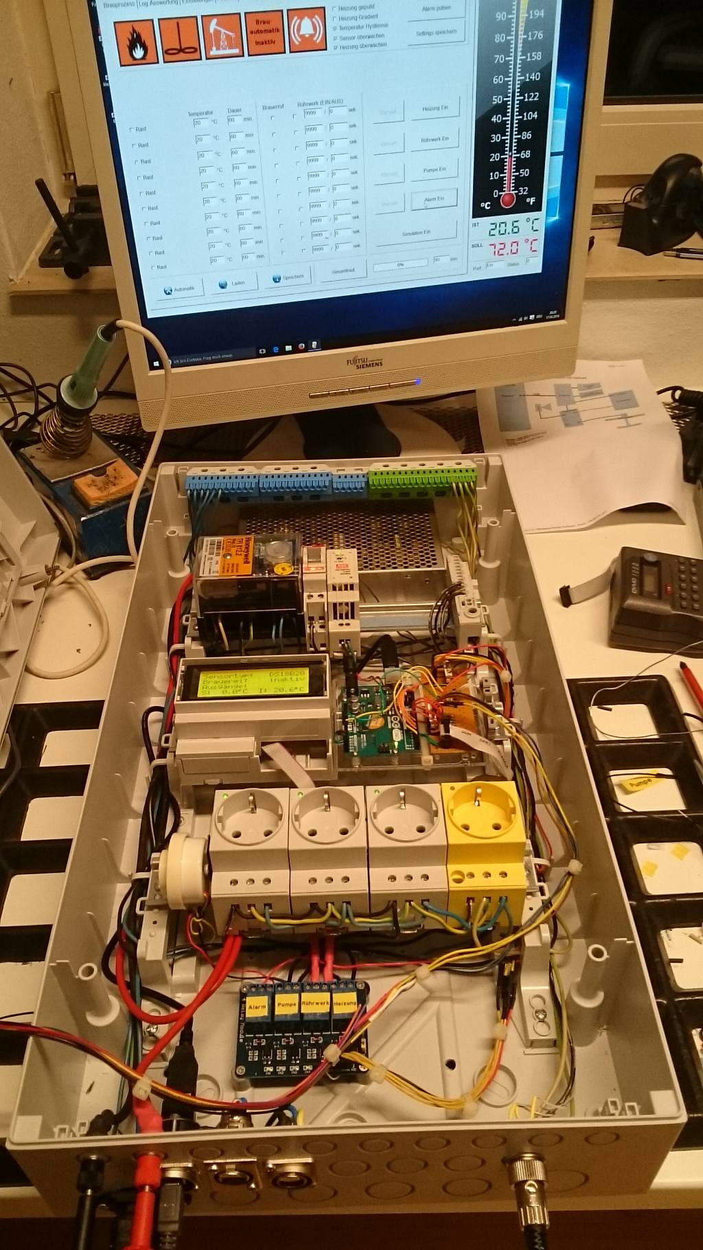 Alle 230V Komponten sind in einem Baustromverteiler drin. Der Brauerruf ist per Piezo-Signalgeber mit integrierter Geräusch-Entwicklung direkt mit dem Arduino verbunden, preiswert und laut.