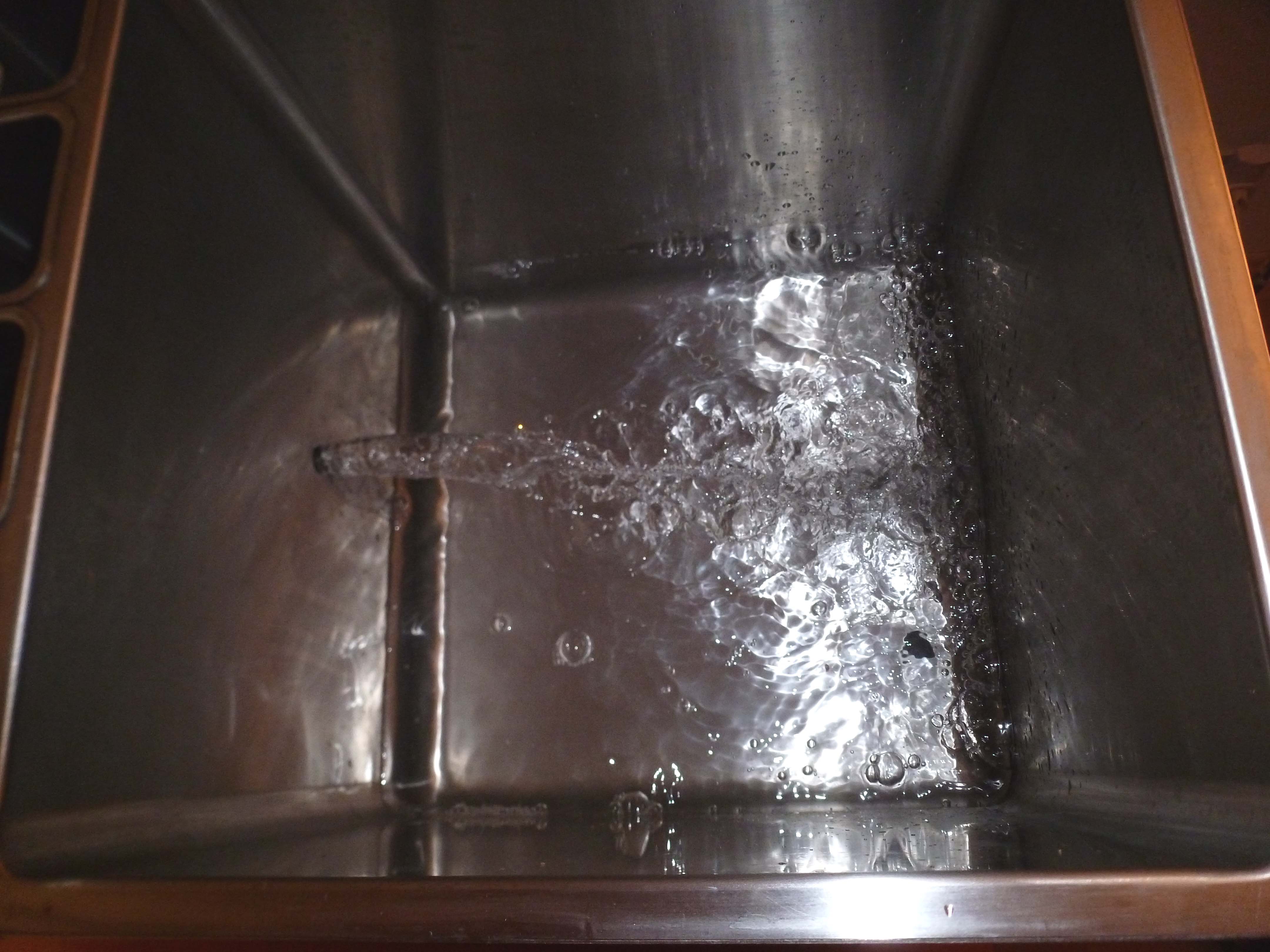 Was mir gleich beim Öffnen des Gerätes auffiel, war ein leicht modriger Geruch darin. Das Erklärte sich aber dadurch, dass das Vorführmodell auch nach dem Abpumpen ca. 200-300 ml Wasser drin behält, was aber für die künftigen Modelle behoben wird. Ebenso werden die Hopfenbehälter aus einem Stück bestehen, die jetzigen Teesiebe werden zu Kästchen die sich nur im eingesetzten Zustand verriegeln lassen und die Wasserauslässe von den Hopfenkästchen werden direkt in den Würzekessel (der linke Kasten) geleitet über wellenförmige Ausschnitte. Außerdem werden die Abflüsse verbessert mit einem leichten Gefälle im Boden zu diesen hin.