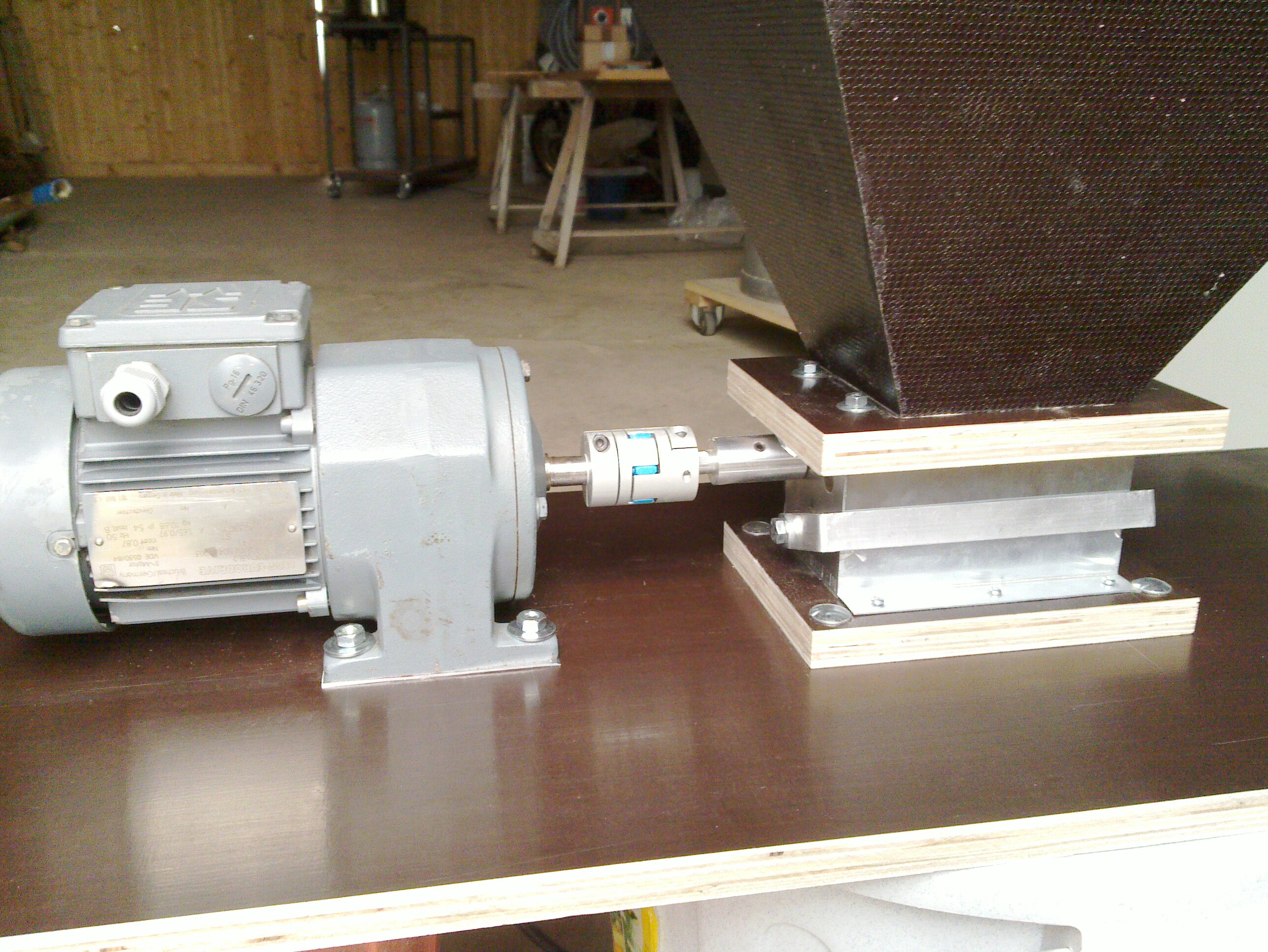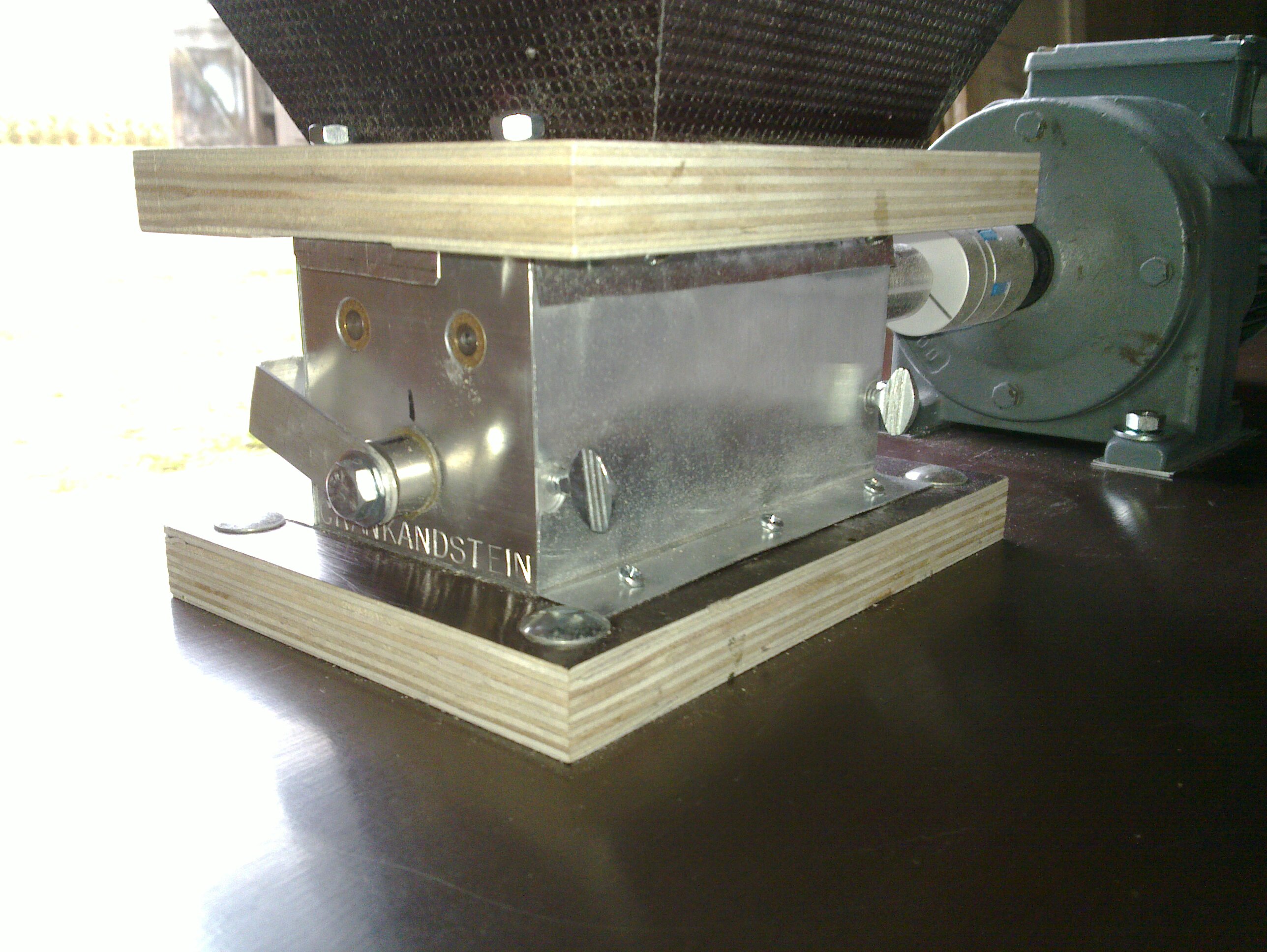 Der Trichter ist da schon um einiges schwieriger herzustellen, der Antrieb ist ein SEW-Getriebemotor und die Kupplung stammt aus der Bucht. Die schichtverleimte Platte, auf der der Trichter sitzt wurde mitten etwas ausgespart, in der Aussparung läuft links und rechts ein Blechstreifen, der jeweils als Schieber dient. Damit kann ich die Durchflussmenge regulieren, notfalls kann ich den Malzfluss auch komplett stoppen.
