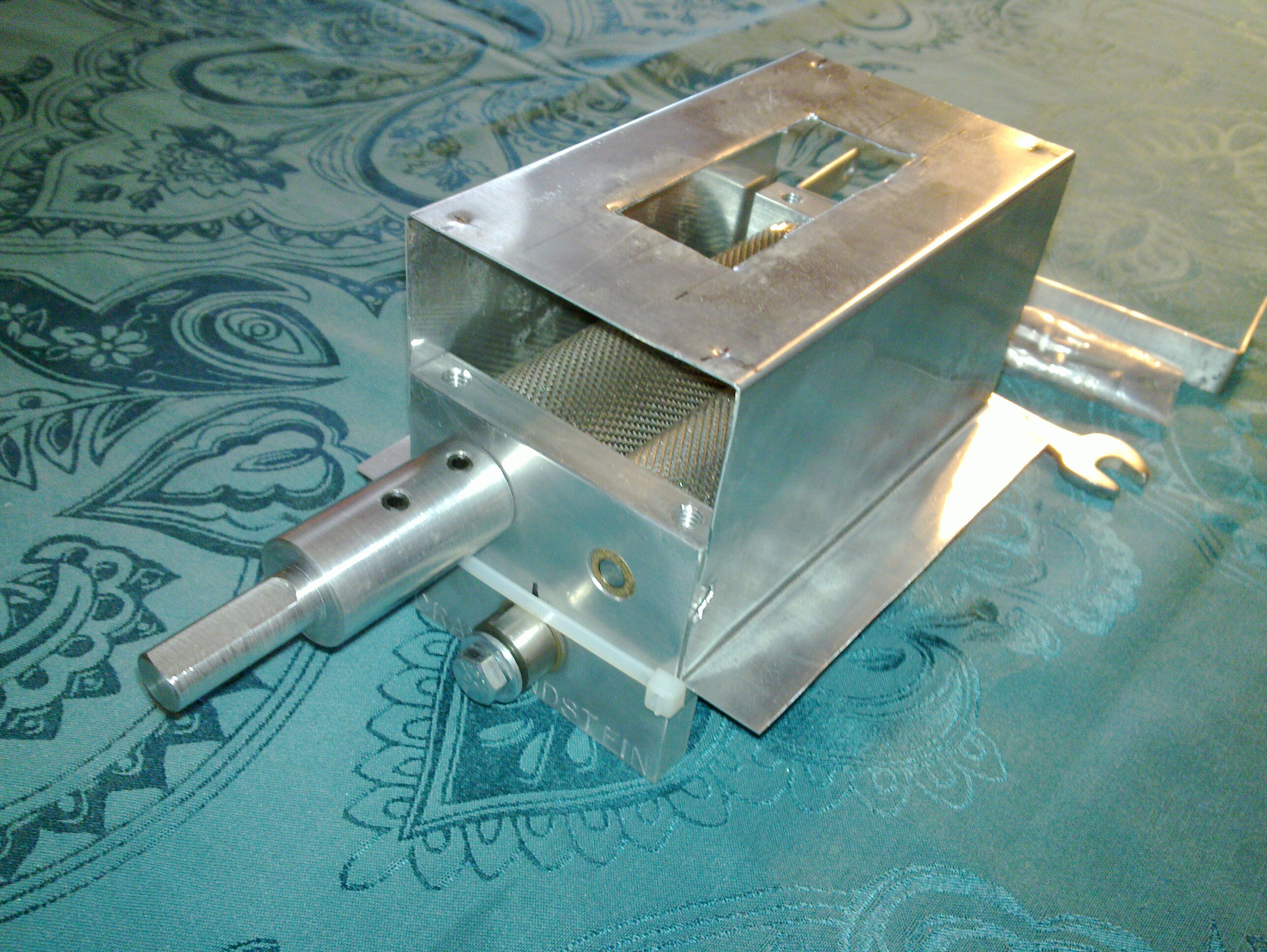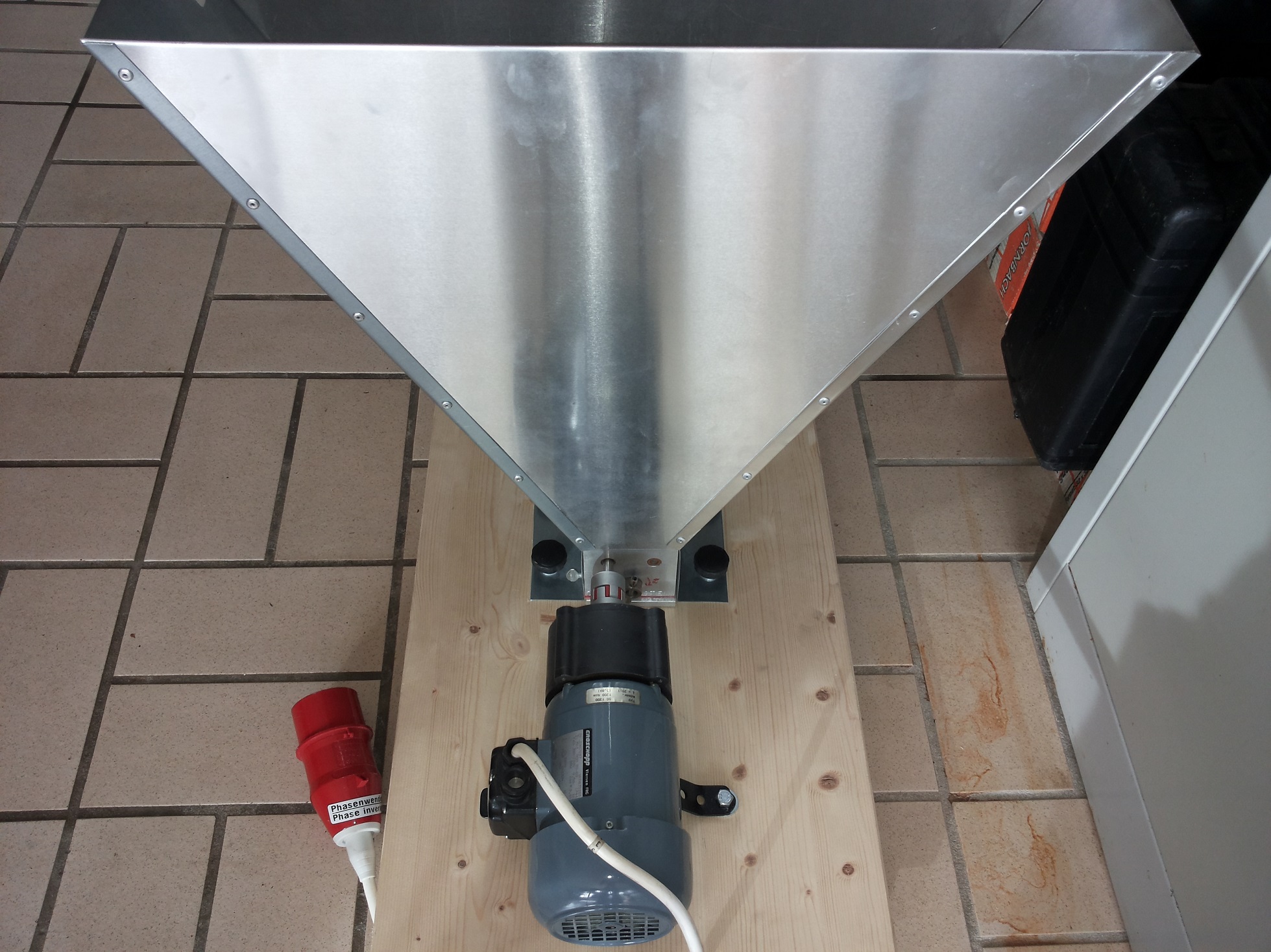 Der Trichter ist da schon um einiges schwieriger herzustellen, der Antrieb ist ein SEW-Getriebemotor und die Kupplung stammt aus der Bucht. Die schichtverleimte Platte, auf der der Trichter sitzt wurde mitten etwas ausgespart, in der Aussparung läuft links und rechts ein Blechstreifen, der jeweils als Schieber dient. Damit kann ich die Durchflussmenge regulieren, notfalls kann ich den Malzfluss auch komplett stoppen.