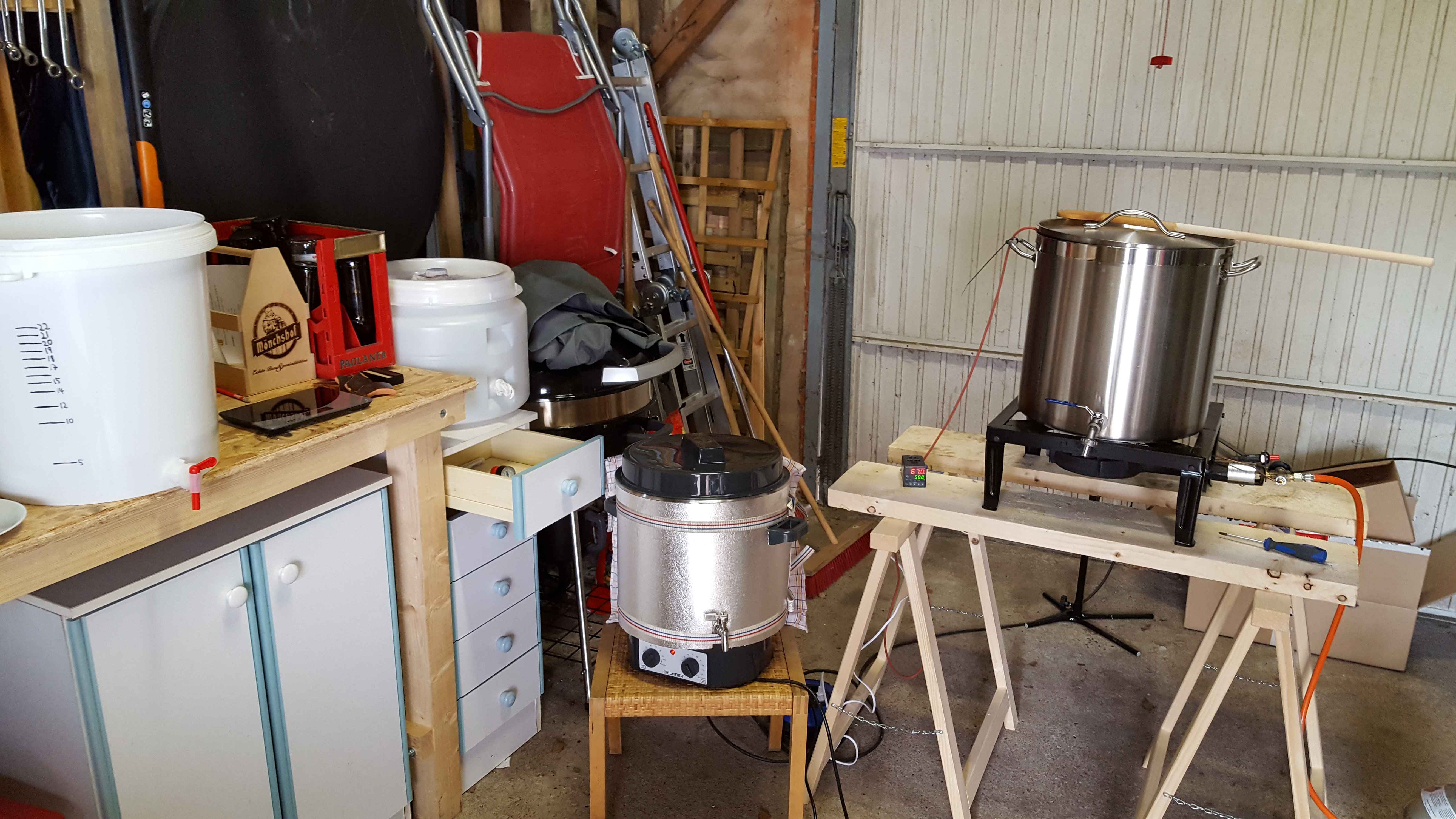 Links der Einkocher für das Nachgusswasser, rechts die Sudpfanne für die Würze/Kochen. Das ist mein erster Sud mit dem neuen Topf. Der EINkocher war mir immer zu klein, das nervt mit dem knappen Platz.