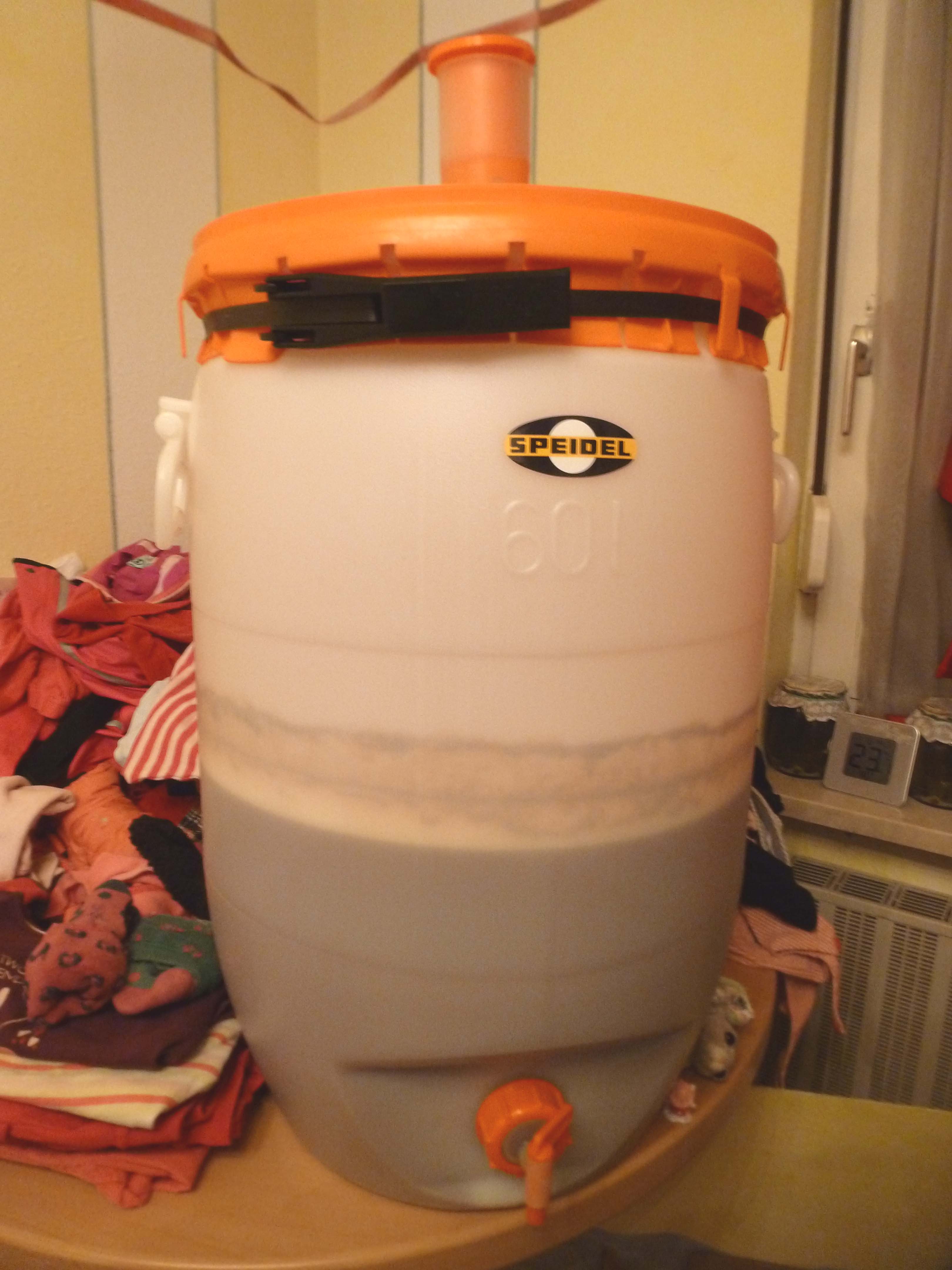 25l Sommerbier von Tauroplu, 26h nach dem Anstellen mit einer Tüte Notti.
