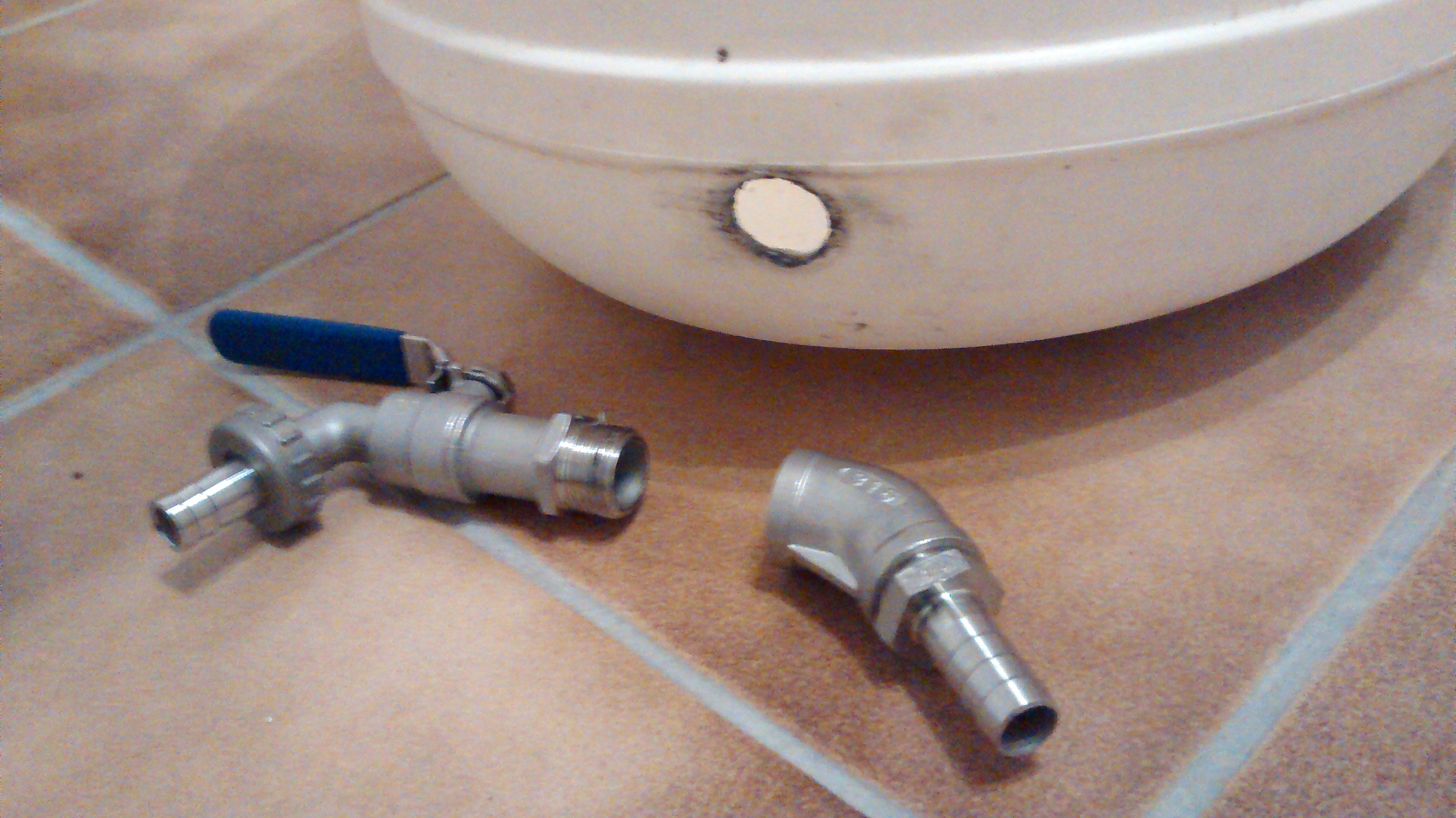 Der Hahn ist außen und der 45°-Winkel mit der Tülle soll in den Bottich und daran dann ein Panzerschlauch zum Läutern.
