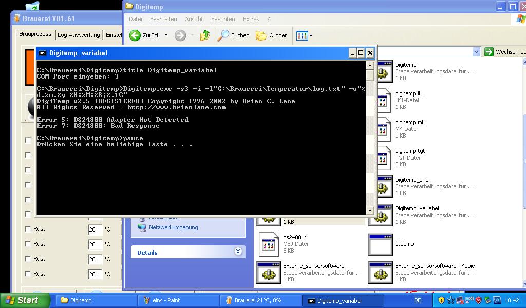 Oder kopiere das Testfile in deinen digitemp Ordner und starte es. Das sollte dir den Sonsor und die Temperatur in einem CMD Fenster anzeigen.... Wenn nicht, ist es warscheinlich dein Sensor. hinüber. Den Tip die Brauerei einmal komplett zu löschen ( auch den Ordner manuell ) und neu zu installieren brauch ich dir ja nicht zu geben, wenn du sogar den Rechner schon neu aufgesetzt hast.