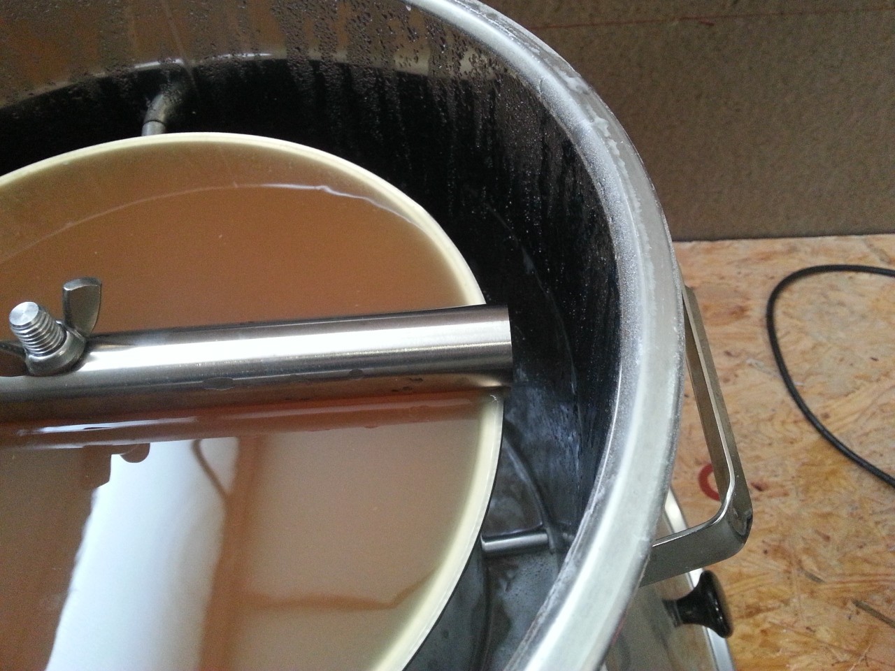 das Flaschengummi zwischen Zugstange und Niederhalter ist ein Rohrkrepierer. Jetzt fließt zwar keine Würze mehr in das Rohr, doch an der Stelle wo das Rohr auf das Malzrohr drückt wird umso mehr Würze an der Unterseite des Rohres weggeleitet und plätschert dann nach unten. Scheinbar hilft wohl nur Kürzen.
