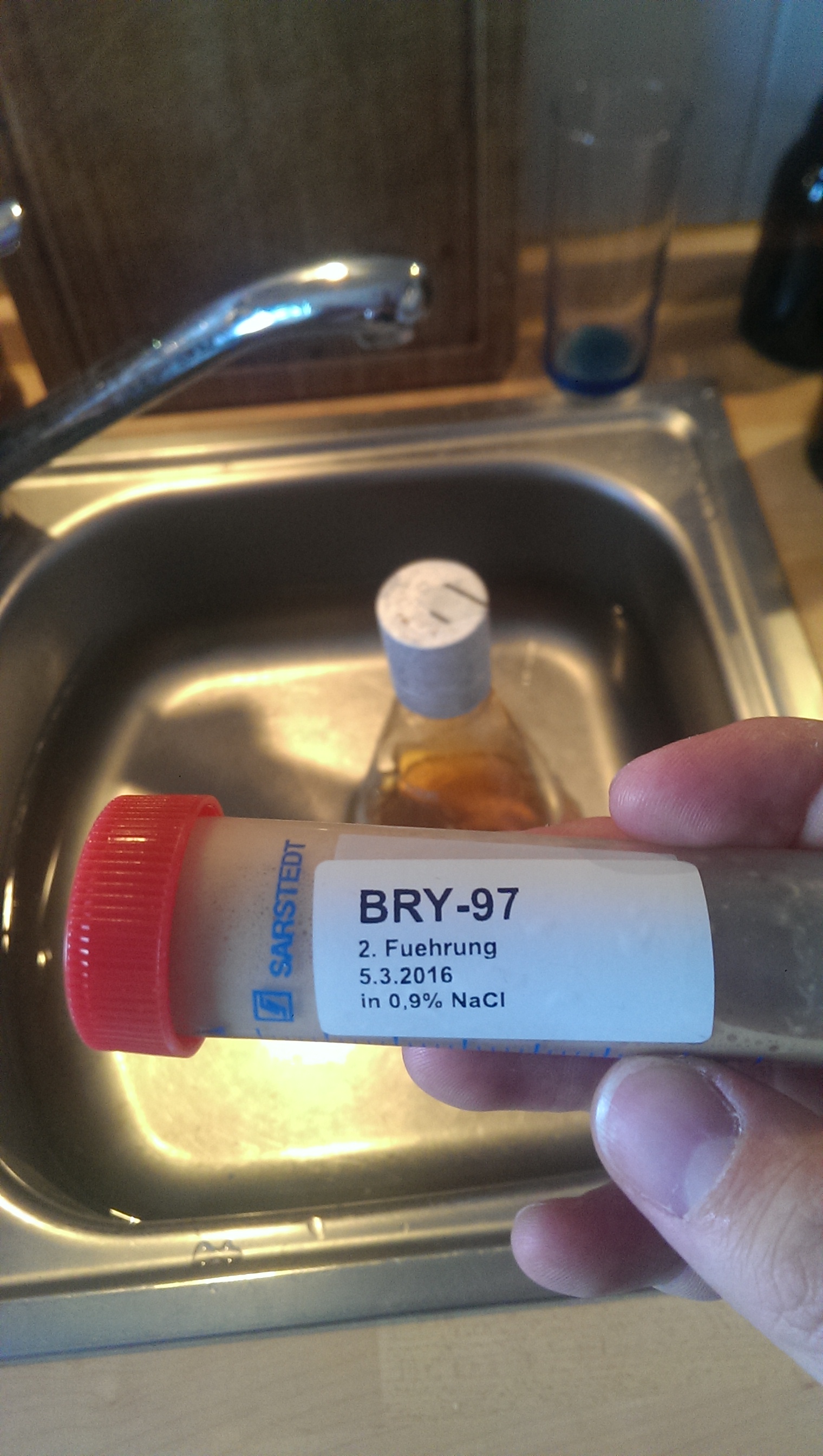 Die Hefe habe ich nach dem Umschlauchen mit isotonischer Kochsalzlosung gelöst. Dann hat sich die Hefe absetzen dürfen und der Überstand wurde weg gegossen. Dann nochmal mit frischer Kochsalzlosung lösen und in Sie Röhrchen abgefüllt.
