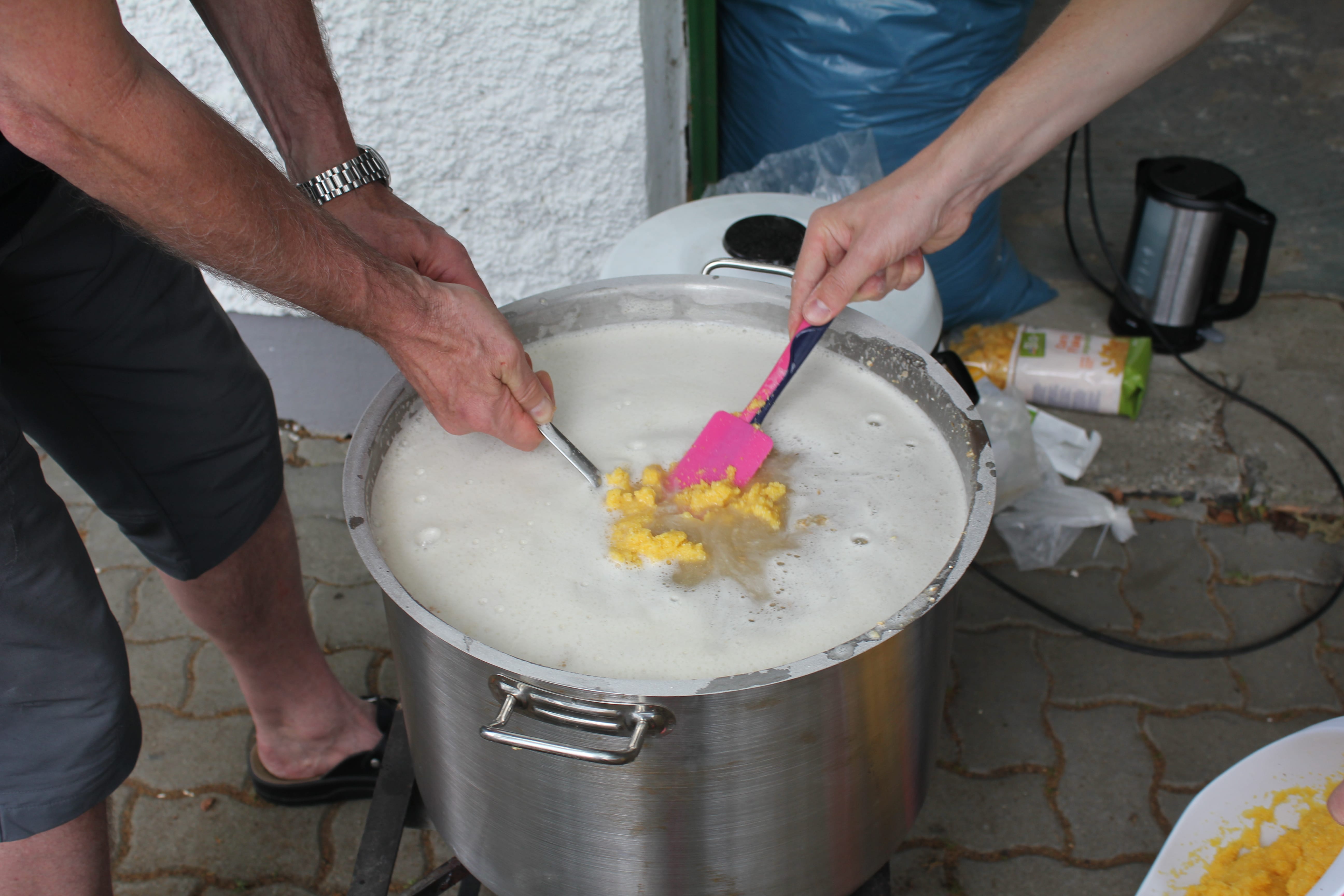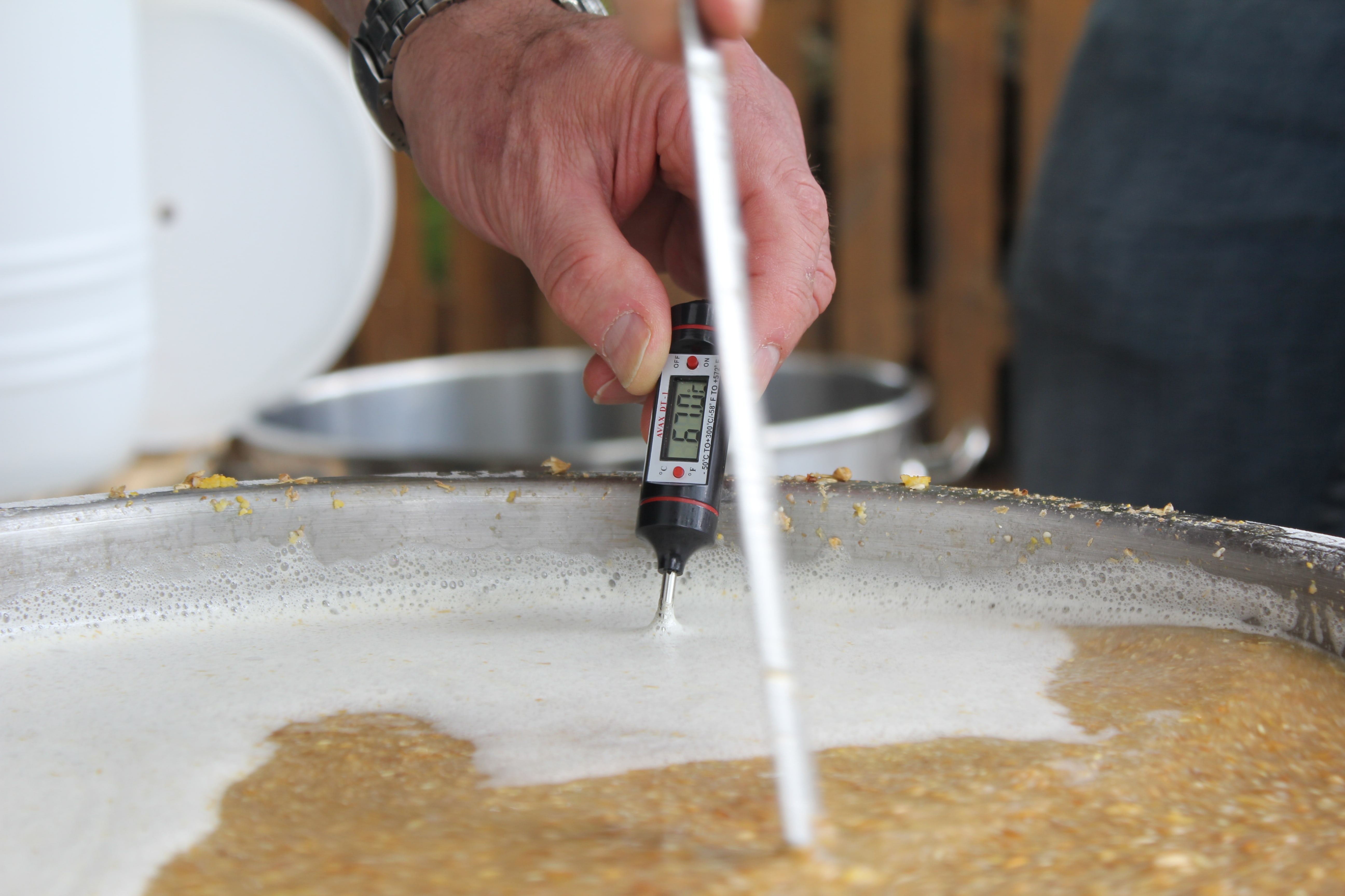 Einmaischen in 30 Liter Wasser mit 74°C ergibt 67°C. 90 Minuten Rast.