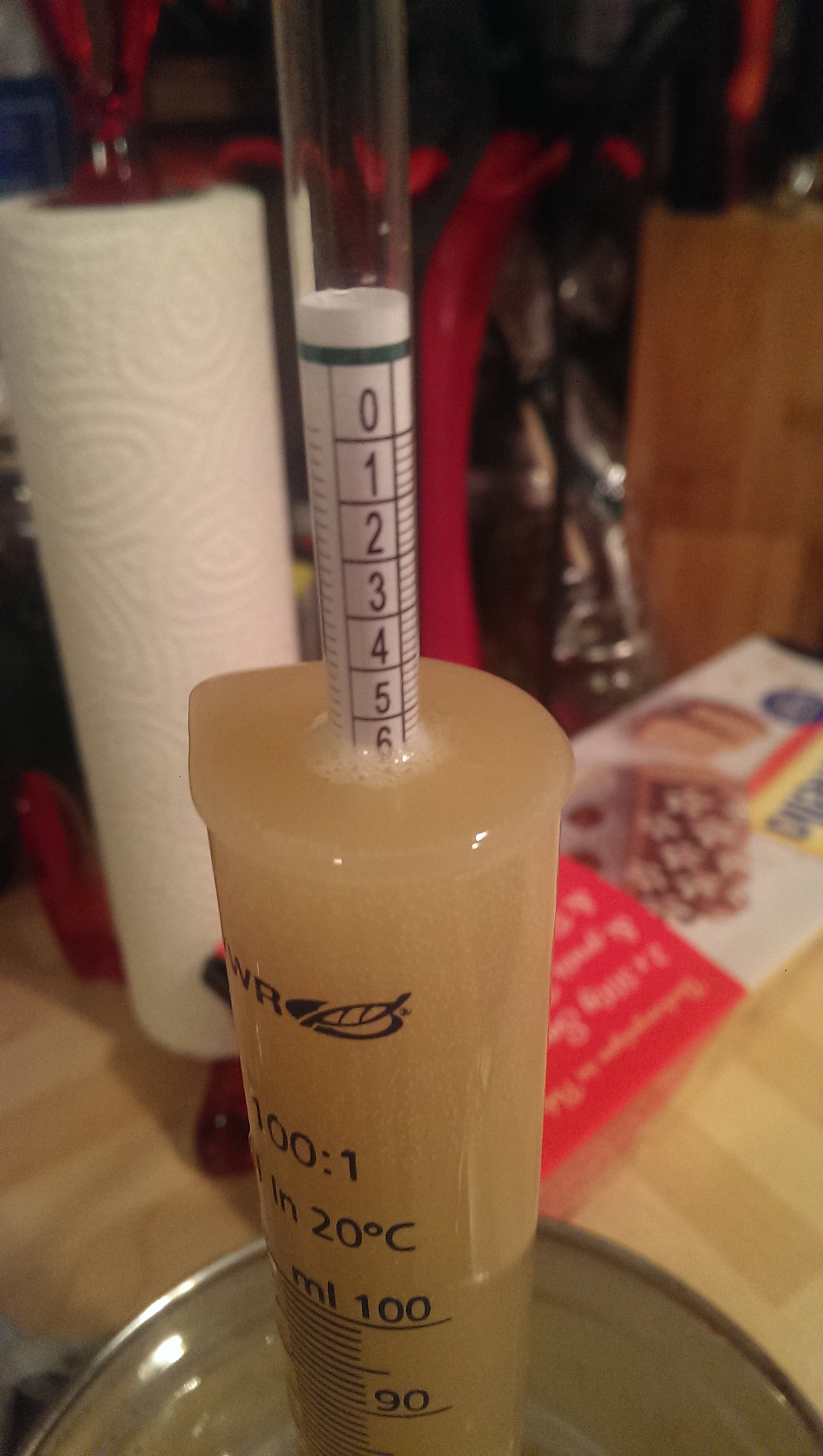 Die Gärung ist im vollen gange. Man sieht auf dem Foto das die Hefe noch schön in der Schwebe ist. Geschmack ist schwer zu beurteilen, müsste trotzdem probieren. Der Geschmack der Hefe überlagert aber fast alles. Die BRY-97 geht gut, denke mit einem guten Starter und in zweiter Führung eine absolut empfehlenswerte Hefe.