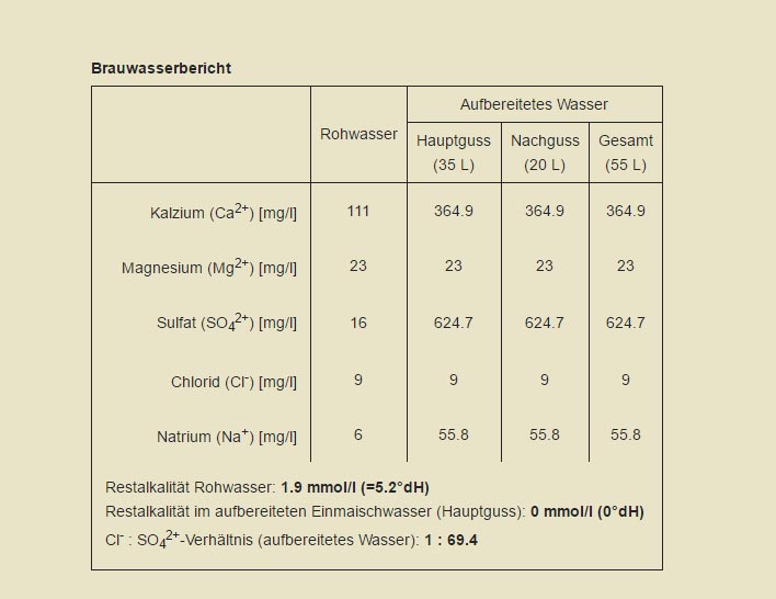 Gemäss Berechnungen mit dem MMuM Tool kann ich mein Wasser relativ einfach ähnlich dem Burton-on-Trent Profil einstellen, wenn ich es für einen Sud (Gesamtvolumen 55L / Hauptguss 35L) mit 60gr CaSO4 x 2H2O (Braugips) und 10gr NaHCO3 (Natron) aufbereite. Zudem 60gr Sauermalz zur Schüttung um die Restalkalität auf 5.2°dH zu bringen. Damit sollte ich doch ein Brauwasser erhalten, dass für Hopfenbetonte IPA's ideal wäre.