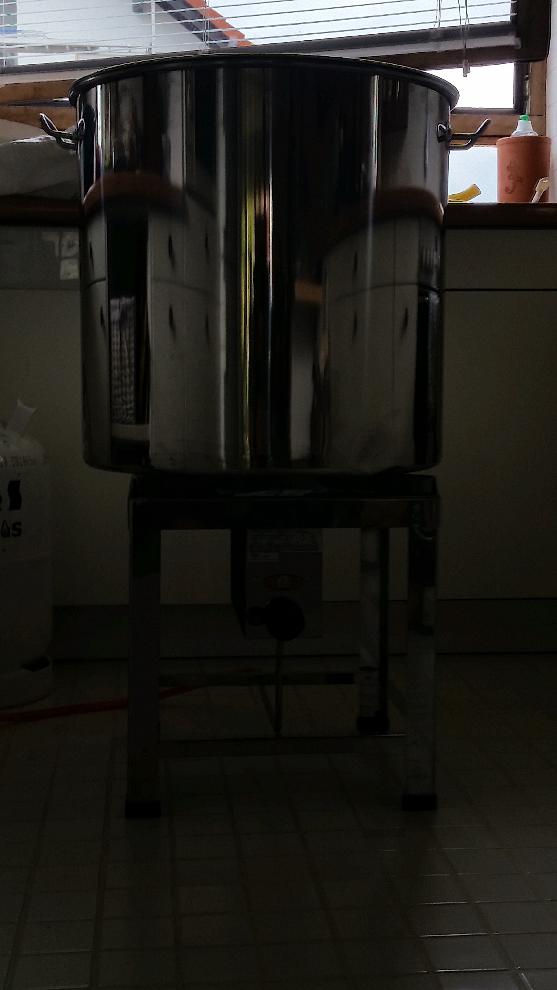 Eigentlich wollte ich einen 70l Topf kaufen, kam aber günstig an einen 100l dran. Macht nix, ich muß ihn ja nicht voll machen. Dazu mußte natürlich auch ein Hockerkocher angeschafft werden.