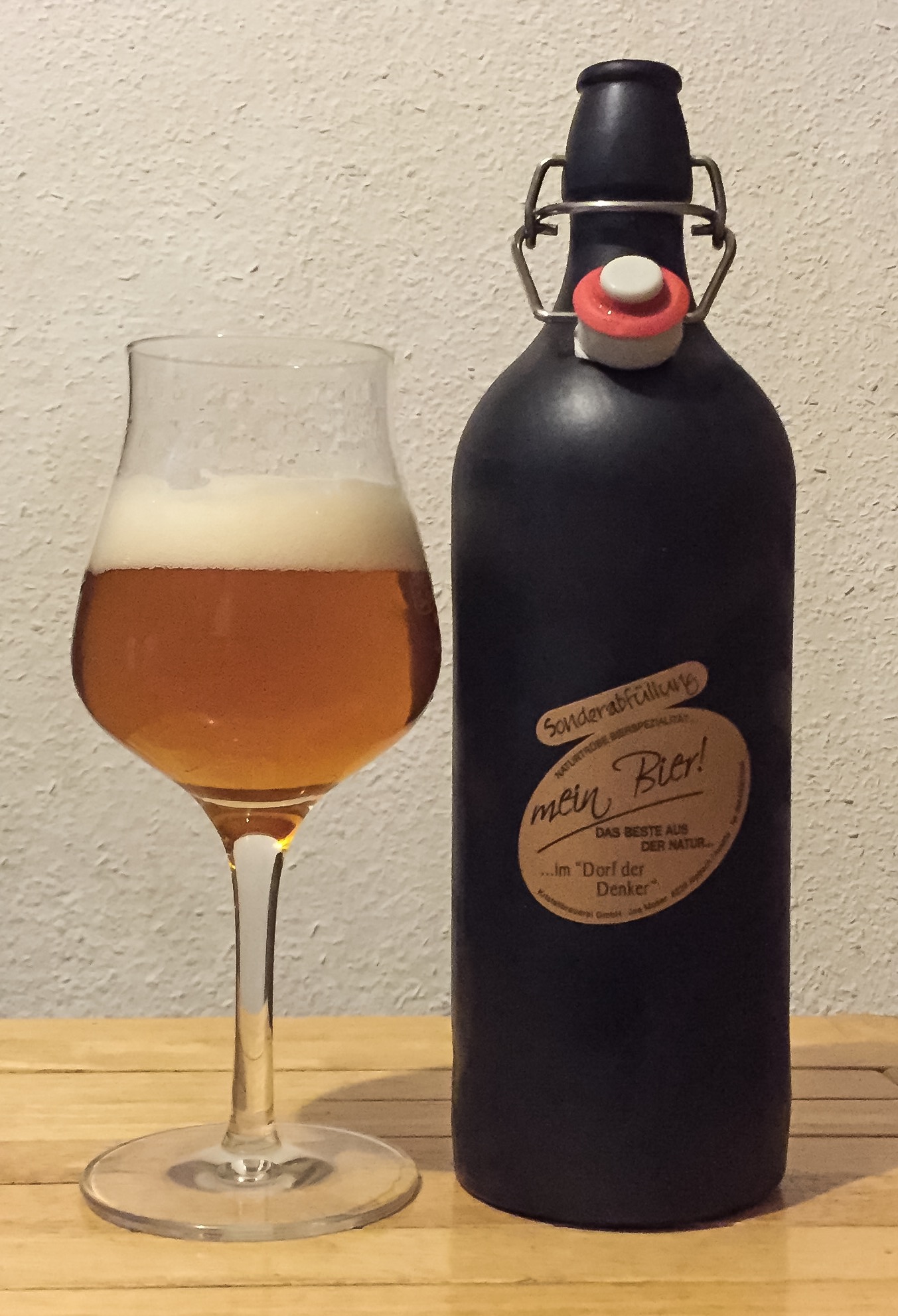 So, Schrankinventur: Das "Bommen & Granaten" von De Molen mit MHD 2040 (kein Tippfehler!!!) hab ich mal nach hinten gestellt, dafür ein "Mein Bier' der gleichnamigen Kristallbrauerei aus Alpbach bei meinen österreichischen Freunden (gekauft bei einem Skiurlaub in Schwaz) mit MHD 02/2015 ausgelagert.