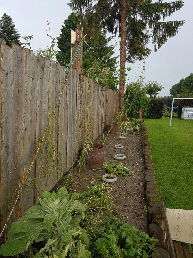 Der Sturm Donnerstagnacht hat hier richtig zugeschlagen. Die zwei großen Fichten, in denen ich die Kletterseile für den Hopfen befestigt hatte, hat es oberhalb des Bretterzaunes einfach abgerissen.
