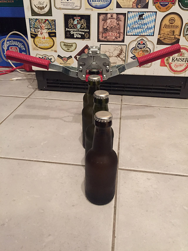 Als alles abgefüllt war, nahm ich - wie immer - je 4...5 Flaschen mit aufgelegtem KK und stellte sie der Reihe nach vor mich auf. Und dann Schwups-schwups-schwups-schwups-und-schwups sind 5 Flaschen verkorkt.