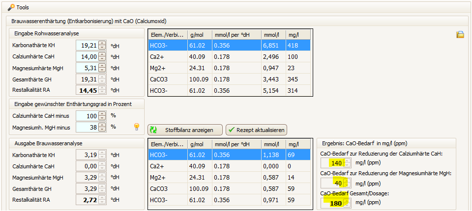 Die Ganze Rechnung stimmt eh nicht, da man für das Ausfällen von Magnesium zwei Equivalente CaO benötigt und nicht eins, wie beim Calcium und das berücksichtigen die Rechner nicht.