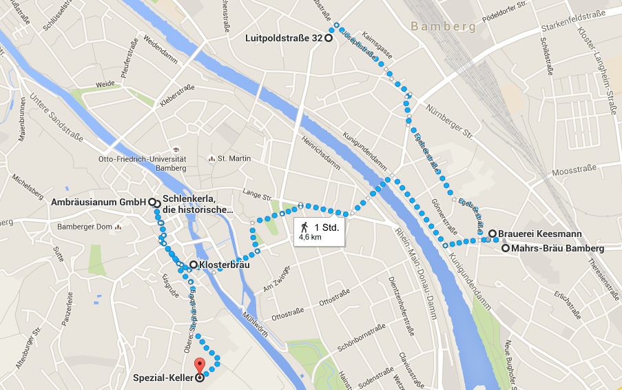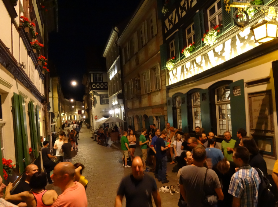 Wir kommen aus Lübeck und sind eigentlich auch mit einer sehr schönen Altstadt gesegnet. Bamberg steht dem in nichts nach. Die Altstadt ist sehr hübsch, man kann alles fußläufig erreichen und man bekommt sehr gutes Bier! Wettertechnisch haben wir ebenfalls den Jackpot gezogen bei 30 Grad und Sonnenschein. Mein persönliches Highlight des Tages war die Keesmann Brauerei. Ich kann jetzt nicht sagen, dass das Bier dort am besten geschmeckt hat, aber irgendwie passte da alles zusammen. Nachdem wir so etwa die Hälfte des Tages rum hatten, sind wir noch ins Freibad an der Regnitz gegangen. Da steppte natürlich der Bär. Aber ich kann euch sagen, dass das Bad im kalten Fluß einen mächtig weit nach vorne bringt. Der Blick vom Spezial Keller über Bamberg ist auch der Knaller und nachdem man 2-3 Rauchbiere getrunken hat gewöhnt man sich auch an den Geschmack. Auf dem Keller, ja so sagt man das hier, haben wir dann auch noch die Hobybbrauer FG100 und BierBauer getroffen. Bisher war der Kontakt immer nur virtuell und nun hat man auch mal ein Gesicht vor Augen. Es ist schon schön, wie das Bierbrauhobby Menschen miteinander verbindet. Insgesamt war es ein sehr schöner Abend bei Bier, zünftigem Essen, sehr netter Gesellschaft und perfektem Wetter.