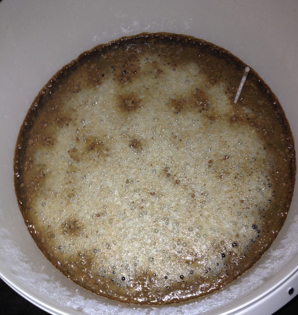 Jetzt kam etwas, was ich noch nicht kannte. Auf der Maische schwammen kleine Pflanzenteile, die wie Keimlinge aussahen (nicht im Bild). Außerdem waren kleine weiße bis leicht grünliche Bröckchen zu sehen.