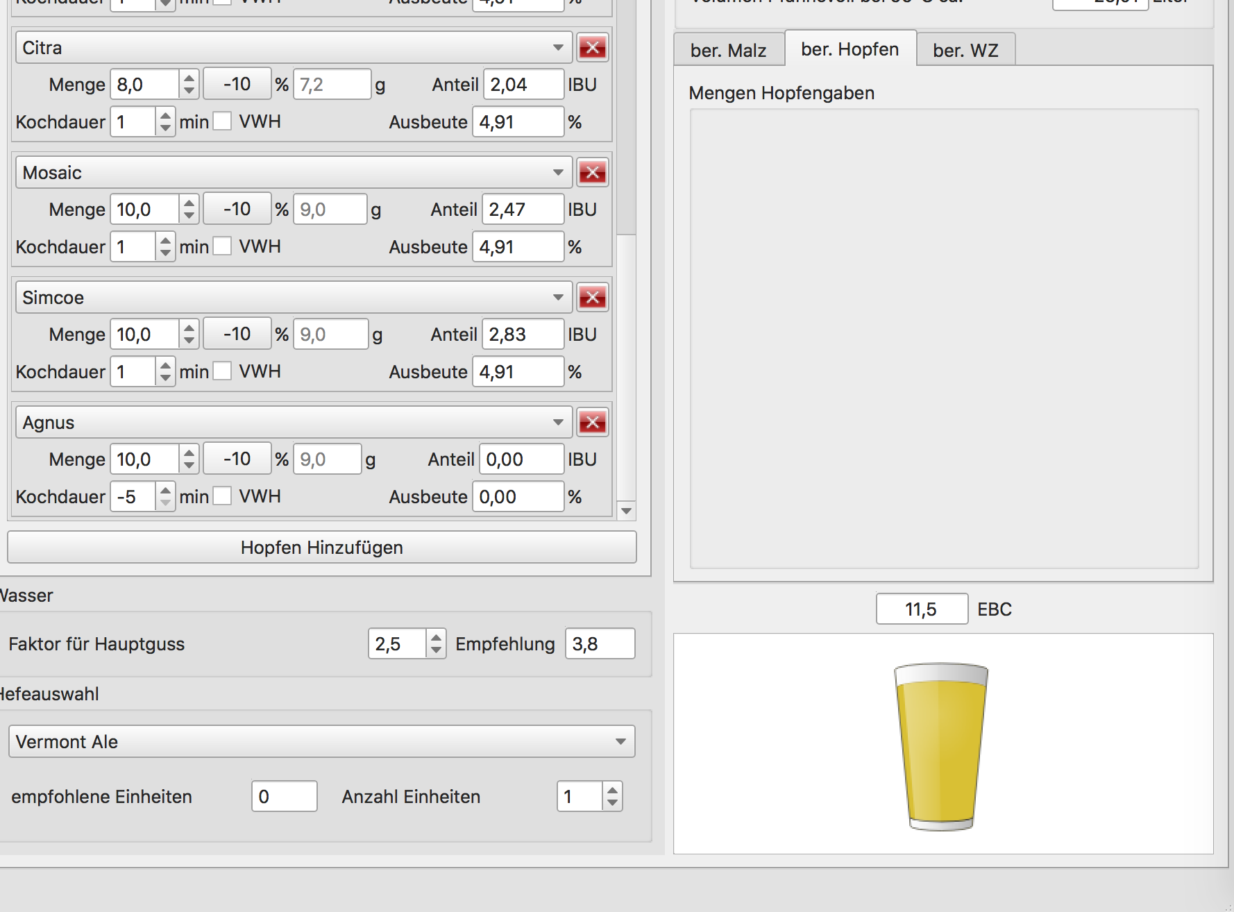 Mit der Zeit wachsen die Ansprüche... ;) Insbesondere für Sude mit Whirlpoolhopfung/"hopbursting"/"hop stand", wäre es toll entweder wie geschrieben die Option bei weiteren Zutaten zu haben oder gleich eine zweite Auswahl im Hopfentab neben der Wahl für "VWH" (zB HB für Whirlpoolhopfung bei 80°C). Ohne dies, ist leider nicht möglich mit einer Nachlaufzeit >0 entsprechende Mengen Hopfen einzutragen. Im Idealfall wäre also bei Wahl von Whirlpoolhopfung, die Hopfenmenge nicht an die IBUs gekoppelt.