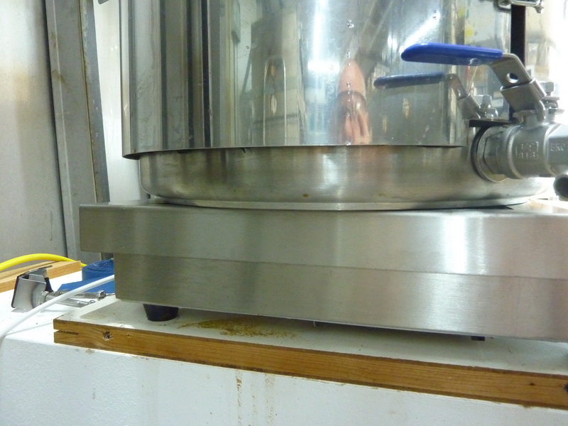 Ich habe von Anfang an hinten an der Platte die kleine Edelstahlleiste abgeschraubt (ist plan mit der Oberfläche) und habe ein Alu-U-Profil von 6 cm breite aus dem Baumarkt passend gesägt, also die Aussparungen für die Lüfter hinten in das Alu-U Profil übertragen. Anschließend habe ich die Alu-Vorrichtung plan hinten anstelle der Leiste angeschraubt. Das Alu-Profil habe ich noch mit zwei kleinen, durch schrauben verstellbaren Alu-Möbelfüssen aus dem Baumarkt versehen. Wenn ich braue , schraube ich die Füße soweit heraus, das sie die Last mit aufnehmen, oben aber das Alu-Profil plan bleibt. Den Topf stelle ich dann vor dem Einmaischen auf die Platte und soweit nach hinten mit auf das Aluprofil, das hier ein Teil der ganzen Last getragen wird. Funktioniert prima auch bei 12 Kg Malz und ca. 50l Wasser. Die Wärmeverteilung ist durch mein Rührwerk gegeben, bei Bedarf kann die Hendi-Platte auch durch Austauschen der Originalleiste gegen das Alu-Profil wieder zurück gebaut werden, sind lediglich 3 Schrauben zu lösen.